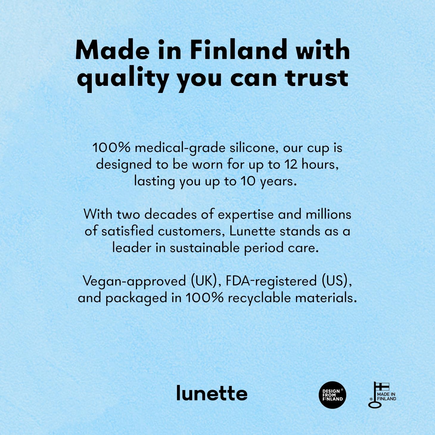 CUP FOR YOU. Your body deserves the best care it can, so our cups are expert approved as well of millions of satisfied customers. Made in Finland for 20 years from 100% medical grade silicone with the highest quality standards that are safe for your body. Lunette Period Cups are registered with FDA (US) and the Vegan Society (UK), and are chemical, latex and BPA-free