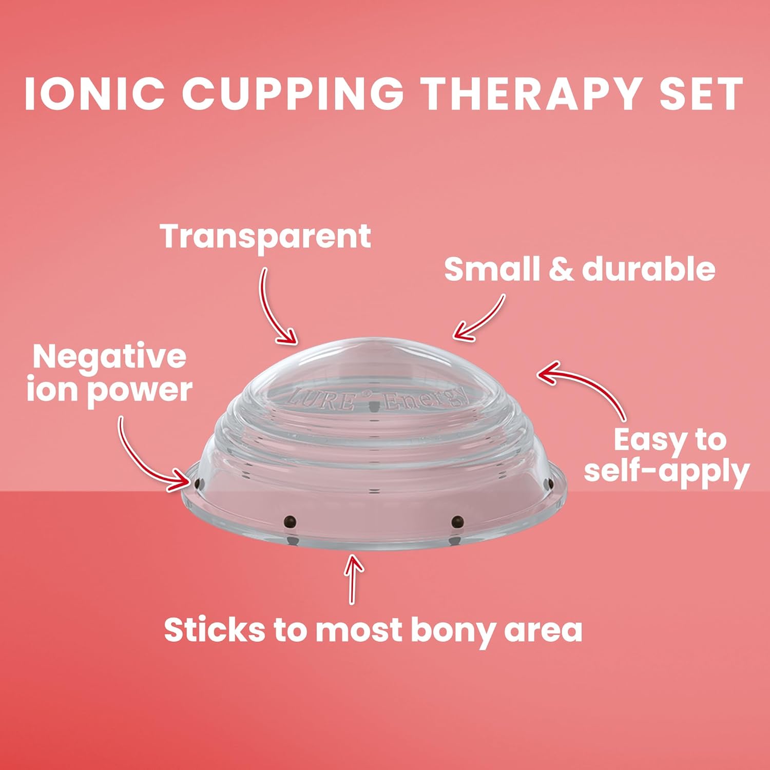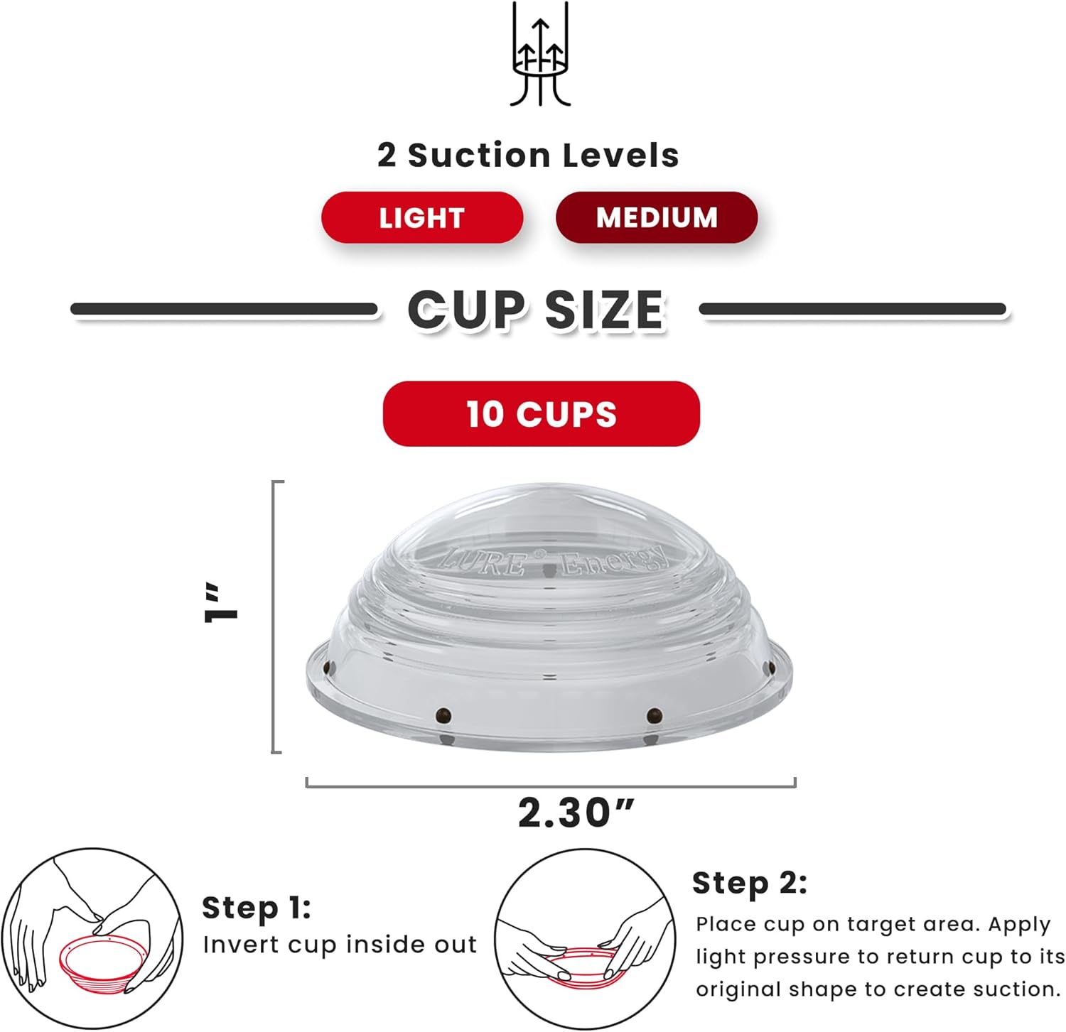 About this item Experience high-performance cupping therapy with our ionic ENERGY set. The 10 (size 2") easy-to-use silicone cups adhere effectively to muscles, joints, and even feet, making this set unmatched in versatility and user-friendliness, suitable for all experience levels. The push or flip design ensures powerful suction with precise control, offering advantage to traditional glass, plastic, or heavy and bulky electric "smart" cups in both stationary and moving techniques. Each cup is embedded with 6 negative ion beads, harnessing the power of ion for faster recovery and improved overall wellness. The ENERGY set's versatility shines in its ability to target various body areas. From neck and back tension to joint support for hands, wrists, elbows, knees, ankles, and feet, these cups provide targeted relief wherever you need it most. Lure Essentials Cupping Sets Comparison: EDGE cups are tailored for full-body treatments, stationary and dynamic massage. ZEN cups are suitable for self-cupping, gliding smoothly for sensitive skin. ENERGY are effective for beginners and advanced cuppers. These small, light cups are easy to put on by yourself. They work well on muscles, joints, and feet. Stationary “parked” method only. Extra: Access to a complete video library. Whether you're a professional therapist or a home user, this cupping set for massage therapy provides everything you need for efficient and safe cupping treatments. Discover the Lure Essentials difference in cupping therapy. › See more product details,Experience high-performance cupping therapy with our ionic ENERGY set. The 10 (size 2") easy-to-use silicone cups adhere effectively to muscles, joints, and even feet, making this set unmatched in versatility and user-friendliness, suitable for all experience levels,The push or flip design ensures powerful suction with precise control, offering advantage to traditional glass, plastic, or heavy and bulky electric "smart" cups in both stationary and moving techniques. Each cup is embedded with 6 negative ion beads, harnessing the power of ion for faster recovery and improved overall wellness,The ENERGY set's versatility shines in its ability to target various body areas. From neck and back tension to joint support for hands, wrists, elbows, knees, ankles, and feet, these cups provide targeted relief wherever you need it most,Lure Essentials Cupping Sets Comparison: EDGE cups are tailored for full-body treatments, stationary and dynamic massage. ZEN cups are suitable for self-cupping, gliding smoothly for sensitive skin. ENERGY are effective for beginners and advanced cuppers. These small, light cups are easy to put on by yourself. They work well on muscles, joints, and feet. Stationary “parked” method only,Extra: Access to a complete video library. Whether you're a professional therapist or a home user, this cupping set for massage therapy provides everything you need for efficient and safe cupping treatments. Discover the Lure Essentials difference in cupping therapy