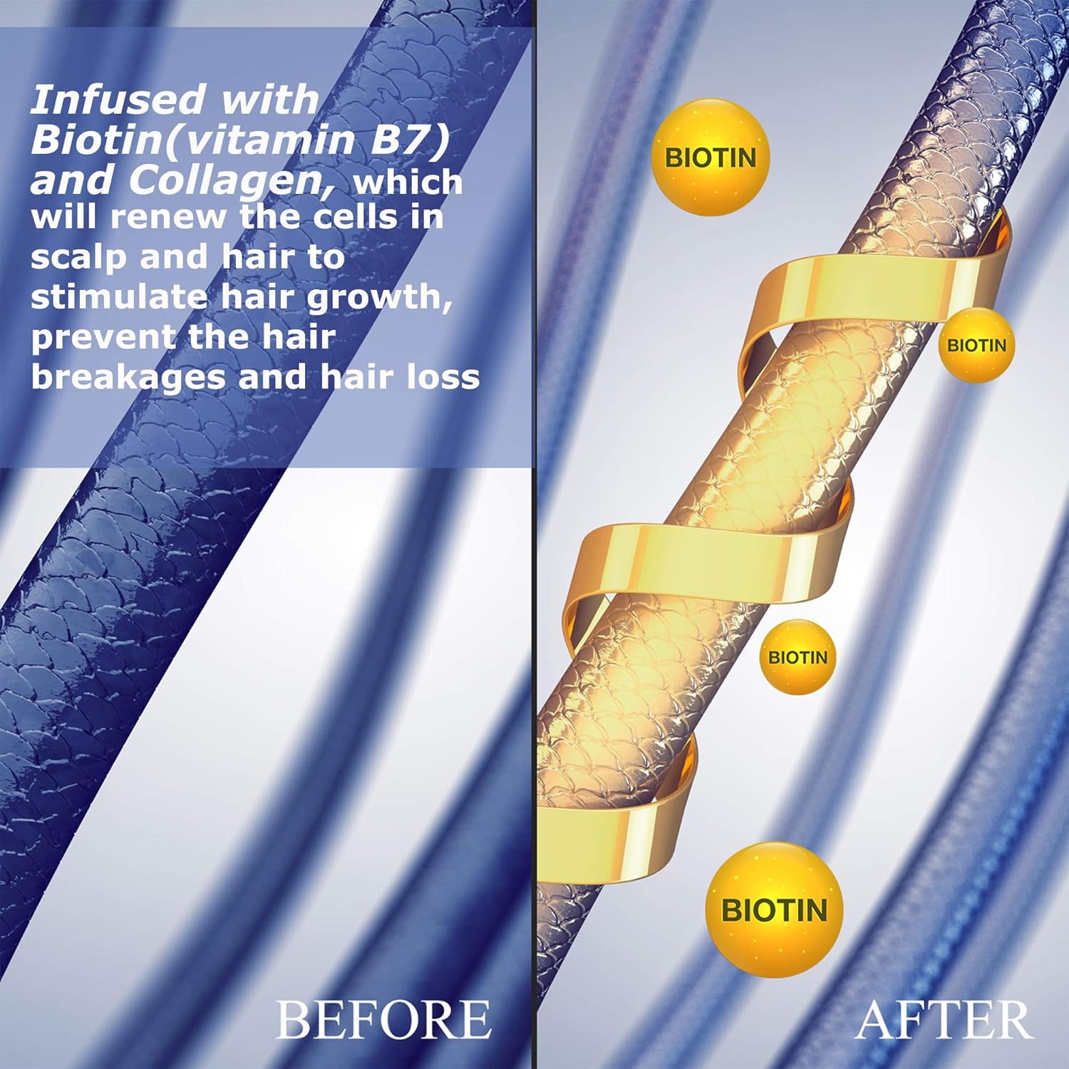 About this item Prevent hair loss and promote hair grwoth. Biotin also known as Vitamin B7 contributes to the production of healthy hair Collagen, the most abundant protein in the human body that helps renew cells, improves the health of skin and hair and ensures the elasticity and regeneration of hair. Helps strengthen and fortify your hair for a thicker and healthier look Adds volume and dimension for fuller look Sulfate and Paraben free and not tested on animals › See more product details,Prevent hair loss and promote hair grwoth. Biotin also known as Vitamin B7 contributes to the production of healthy hair,Collagen, the most abundant protein in the human body that helps renew cells, improves the health of skin and hair and ensures the elasticity and regeneration of hair,Helps strengthen and fortify your hair for a thicker and healthier look,Adds volume and dimension for fuller look,Sulfate and Paraben free and not tested on animals
