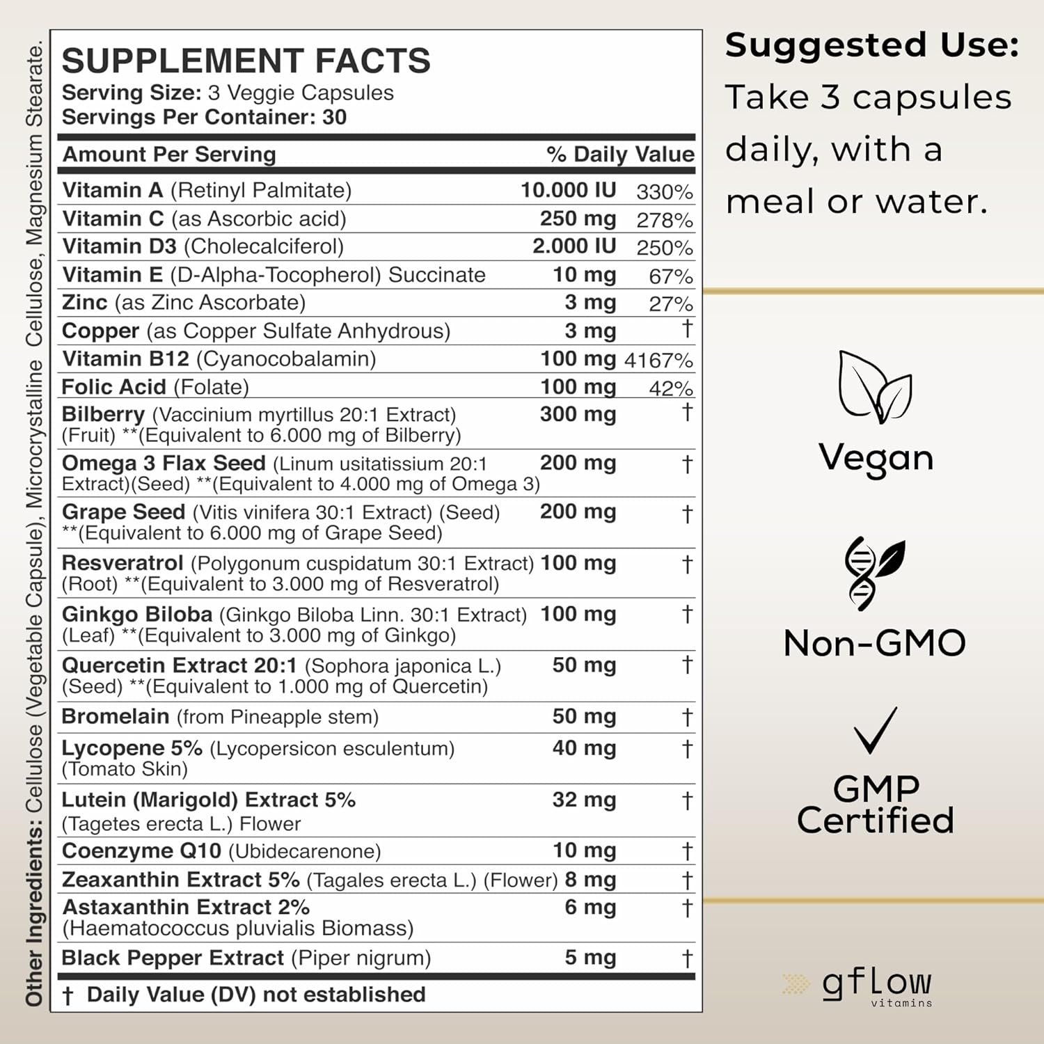 POWERFUL COMPLEX WITH 21 VITAL NUTRIENTS: Gflow Vitamins’ advanced vision support complex includes a range of premium and pure natural ingredients. Lutein extract from Marigold and Zeaxanthin are enriched with Astaxanthin, Lycopene, Bilberry, Omega 3, Grape Seed, Vitamins A, C, D, E and B12, Zinc, Cooper, Folic Acid, Resveratrol, Ginkgo Biloba, Quercetin, Bromelain, Coenzyme Q10, and Black Pepper extract for better absorption