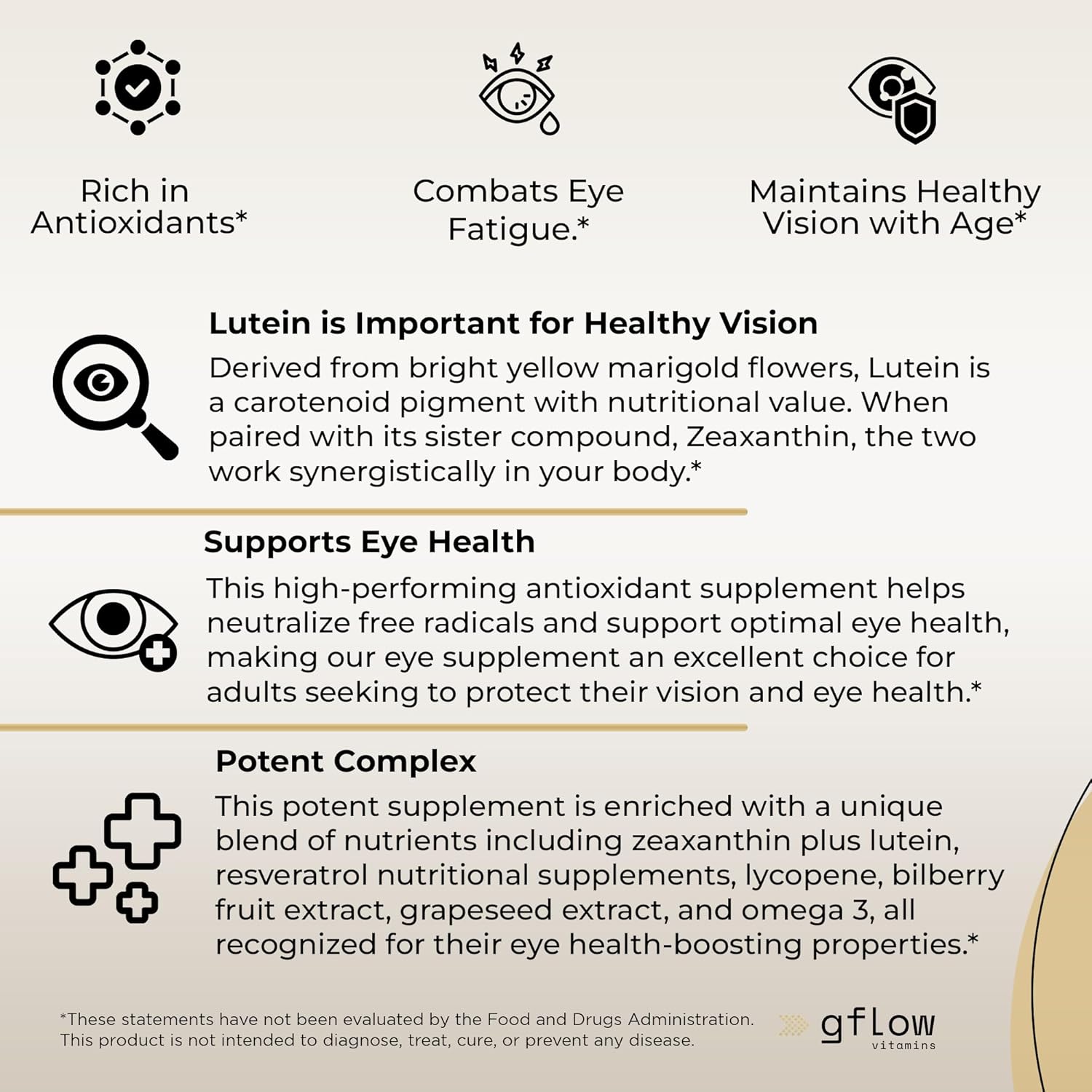 About this item ADVANCED FORMULA EYE VITAMINS: Our Lutein and zeaxanthin supplements are enhanced with powerful natural antioxidants. Featuring the carotenoids Lutein and Zeaxanthin, our eye support formula combines 21 highly concentrated ingredients. It’s carefully crafted to offer you an effective holistic approach for overall eye care. This supplement is a potent antioxidant, helping neutralize free radicals. It’s the better choice for adults seeking to protect their vision and eye health EYE HEALTH AND VISION PROTECTION: Lutein with Zeaxanthin blend helps to promote long-term eye health and visual function, improving fine detail vision and night vision. Our eye vitamin also helps combat eye fatigue and dry eyes, and preserves retinal health. Designed based on the AREDS or AREDS2 study, it may have positive effects on vision health, sleep quality, and can reduce occasional eye strain from long exposure to screens. Astaxanthin is also a great support for skin health LONG TERM CARE: With an amazing combination of powerful antioxidants, this formula goes beyond ordinary eye health vitamins. Our special blend offers the most potent support to your body's natural defense against age-related eye conditions, providing superior eye care in each capsule. Resveratrol extract is a potent antioxidant found in grape skin, and lycopene, known for its impressive antioxidant properties, works synergistically to give a comprehensive complement for eye health POWERFUL COMPLEX WITH 21 VITAL NUTRIENTS: Gflow Vitamins’ advanced vision support complex includes a range of premium and pure natural ingredients. Lutein extract from Marigold and Zeaxanthin are enriched with Astaxanthin, Lycopene, Bilberry, Omega 3, Grape Seed, Vitamins A, C, D, E and B12, Zinc, Cooper, Folic Acid, Resveratrol, Ginkgo Biloba, Quercetin, Bromelain, Coenzyme Q10, and Black Pepper extract for better absorption SAFE STANDARD QUALITY: Our products are manufactured in the USA. Made in an FDA-registered laboratory that is GMP certified. We hold ourselves to high standards of natural purity, potency, and third party tests. Our supplements are made with non-GMO, gluten-free, sugar-free ingredients, no stimulants, no binders, no filters, no allergens, no chemical or synthetic substitutes See more product details,ADVANCED FORMULA EYE VITAMINS: Our Lutein and zeaxanthin supplements are enhanced with powerful natural antioxidants. Featuring the carotenoids Lutein and Zeaxanthin, our eye support formula combines 21 highly concentrated ingredients. It’s carefully crafted to offer you an effective holistic approach for overall eye care. This supplement is a potent antioxidant, helping neutralize free radicals. It’s the better choice for adults seeking to protect their vision and eye health,EYE HEALTH AND VISION PROTECTION: Lutein with Zeaxanthin blend helps to promote long-term eye health and visual function, improving fine detail vision and night vision. Our eye vitamin also helps combat eye fatigue and dry eyes, and preserves retinal health. Designed based on the AREDS or AREDS2 study, it may have positive effects on vision health, sleep quality, and can reduce occasional eye strain from long exposure to screens. Astaxanthin is also a great support for skin health,LONG TERM CARE: With an amazing combination of powerful antioxidants, this formula goes beyond ordinary eye health vitamins. Our special blend offers the most potent support to your body's natural defense against age-related eye conditions, providing superior eye care in each capsule. Resveratrol extract is a potent antioxidant found in grape skin, and lycopene, known for its impressive antioxidant properties, works synergistically to give a comprehensive complement for eye health,POWERFUL COMPLEX WITH 21 VITAL NUTRIENTS: Gflow Vitamins’ advanced vision support complex includes a range of premium and pure natural ingredients. Lutein extract from Marigold and Zeaxanthin are enriched with Astaxanthin, Lycopene, Bilberry, Omega 3, Grape Seed, Vitamins A, C, D, E and B12, Zinc, Cooper, Folic Acid, Resveratrol, Ginkgo Biloba, Quercetin, Bromelain, Coenzyme Q10, and Black Pepper extract for better absorption,SAFE STANDARD QUALITY: Our products are manufactured in the USA. Made in an FDA-registered laboratory that is GMP certified. We hold ourselves to high standards of natural purity, potency, and third party tests. Our supplements are made with non-GMO, gluten-free, sugar-free ingredients, no stimulants, no binders, no filters, no allergens, no chemical or synthetic substitutes