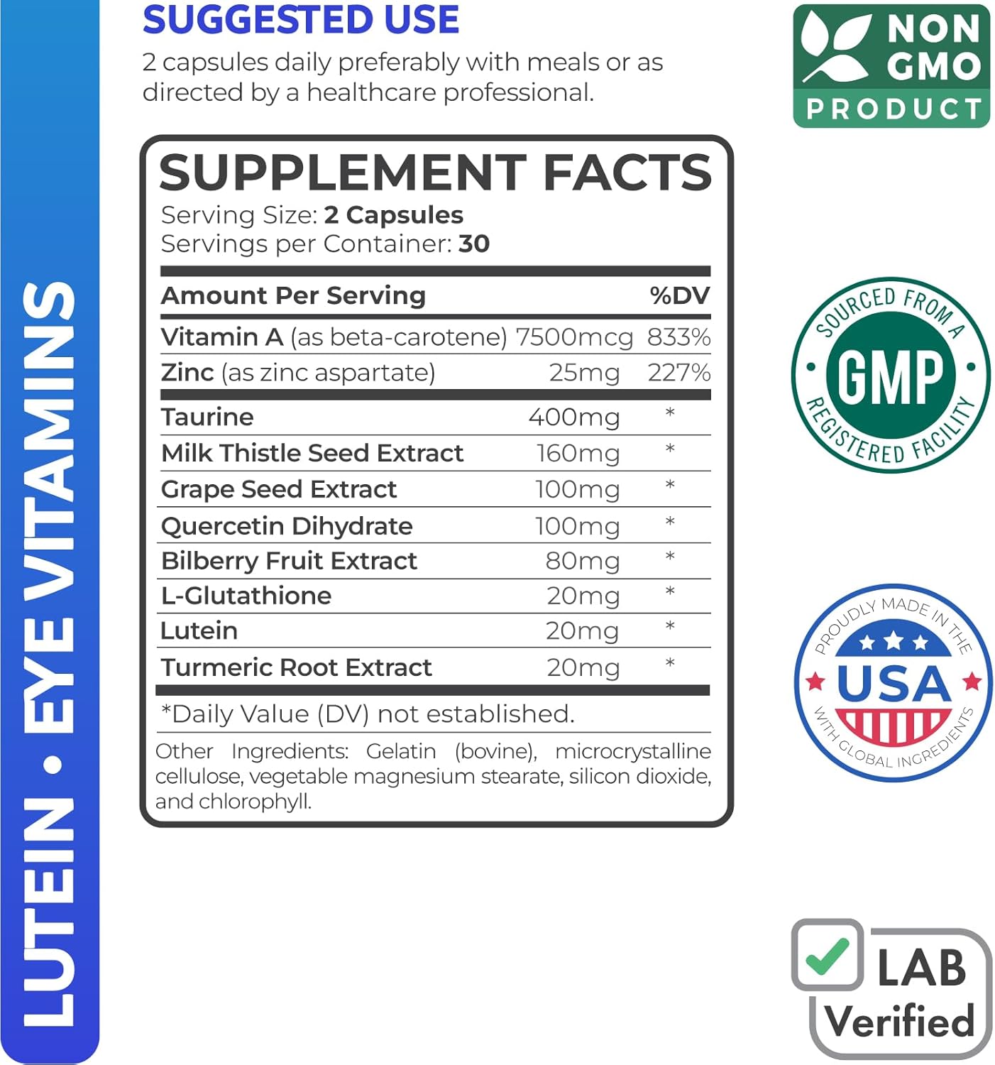 Lutein Eye Vitamins (Non-Gmo) Vision Support Supplement For Tired And Dry Eyes - Maintain Vision Health With Zinc & Powerful Bilberry, Milk Thistle, Grape Seed, And Turmeric Extracts - 60 Capsules