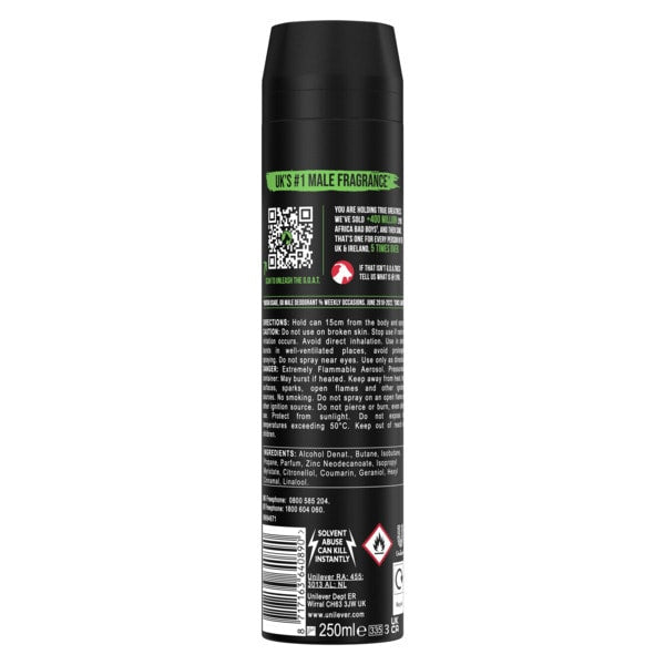 We'Ve Sold +400 Million Lynx Africa Bad Boys And Then Some. That Is One For Every Person In The Uk & Ireland Five Times Over. With Our Africa Bodyspray, You Get 48 Hours Of Lynx'S High-Definition, G.O.A.T. Squeezed Mandarin And Sandalwood Fragrance Combo. Lynx Africa Bodyspray Gives You 48 Hours Of Odour Protection With Our Revolutionary Dual-Action Odour-Busting Zinc Technology, Keeping You Smelling Awesome And Feeling Chill, All Day. You Never Know When Opportunity Will Strike, So You Need A Bodyspray ThatβS Going To Keep You Smelling Iconic And Feeling Confident No Matter The Circumstances. How To Use It? Shaking The Can Well And Holding It 15 Cm Away From Your Body, Spray Across Your Chest In A Well-Ventilated Area For G.O.A.T. Level Fragrance. Avoid Contact With Eyes And Broken Skin. G.O.A.T. Lynx Bodyspray Deodorant Comes In An Infinitely Recyclable Aerosol Can β Fresher You, Cleaner Planet. By 2025, Lynx Aims For All Our Packaging To Be Recyclable Or To Include Recycled Materials. Welcome To The Future. It Smells Amazing. Lynx. *Kantar Usage, Gb Male Deodorant % Weekly Occasions. June 2018β2022. Lynx Africa Is The Uk'S #1 Male Fragrance* β When You Pick Up This Bodyspray, You Are Holding True Greatness This Lynx Africa Bodyspray With Dual-Action Odour-Busting Zinc Technology Gives You 48Hours Of Protection And High-Definition Fragrance No Matter What Comes Your Way, Lynx Africa Bodyspray Has Got You Covered With The Warm Fragrance Of Squeezed Mandarin And Sandalwood Embrace The G.O.A.T. Sensation Of This Lynx Bodyspray Deodorant With Its Uniquely Warm Fragrance This Bodyspray Has The Iconic Lynx Africa Deodorant Fragrance With A Fresh New Look. The G.O.A.T. G.O.A.T. Lynx Bodyspray In An Infinitely Recyclable Aerosol Can β Fresher You, Cleaner Planet