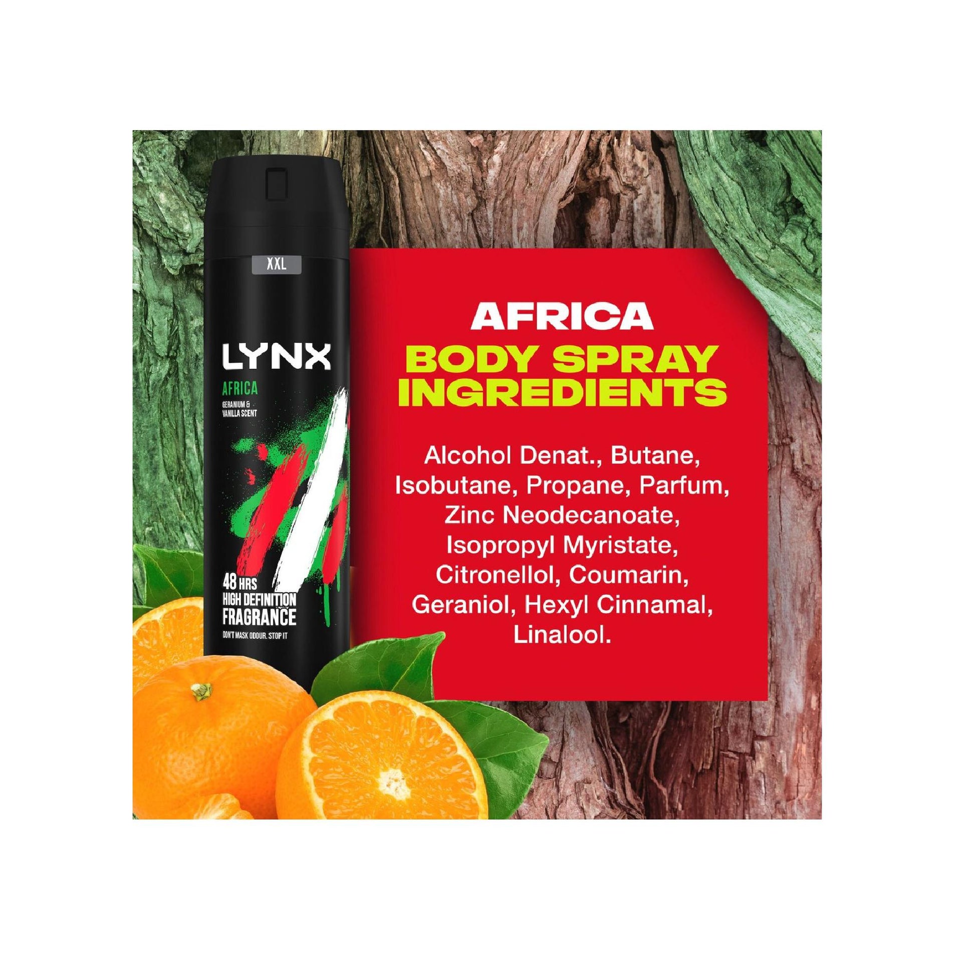 Product Information:You are holding true greatness. LYNX's Africa is the UK's #1 fragrance* β you don't want to be the one missing out!,Features:We'Ve Sold +400 Million Lynx Africa Bad Boys And Then Some. That Is One For Every Person In The Uk & Ireland Five Times Over. With Our Africa Bodyspray, You Get 48 Hours Of Lynx'S High-Definition, G.O.A.T. Squeezed Mandarin And Sandalwood Fragrance Combo. Lynx Africa Bodyspray Gives You 48 Hours Of Odour Protection With Our Revolutionary Dual-Action Odour-Busting Zinc Technology, Keeping You Smelling Awesome And Feeling Chill, All Day. You Never Know When Opportunity Will Strike, So You Need A Bodyspray ThatβS Going To Keep You Smelling Iconic And Feeling Confident No Matter The Circumstances. How To Use It? Shaking The Can Well And Holding It 15 Cm Away From Your Body, Spray Across Your Chest In A Well-Ventilated Area For G.O.A.T. Level Fragrance. Avoid Contact With Eyes And Broken Skin. G.O.A.T. Lynx Bodyspray Deodorant Comes In An Infinitely Recyclable Aerosol Can β Fresher You, Cleaner Planet. By 2025, Lynx Aims For All Our Packaging To Be Recyclable Or To Include Recycled Materials. Welcome To The Future. It Smells Amazing. Lynx. *Kantar Usage, Gb Male Deodorant % Weekly Occasions. June 2018β2022. Lynx Africa Is The Uk'S #1 Male Fragrance* β When You Pick Up This Bodyspray, You Are Holding True Greatness This Lynx Africa Bodyspray With Dual-Action Odour-Busting Zinc Technology Gives You 48Hours Of Protection And High-Definition Fragrance No Matter What Comes Your Way, Lynx Africa Bodyspray Has Got You Covered With The Warm Fragrance Of Squeezed Mandarin And Sandalwood Embrace The G.O.A.T. Sensation Of This Lynx Bodyspray Deodorant With Its Uniquely Warm Fragrance This Bodyspray Has The Iconic Lynx Africa Deodorant Fragrance With A Fresh New Look. The G.O.A.T. G.O.A.T. Lynx Bodyspray In An Infinitely Recyclable Aerosol Can β Fresher You, Cleaner Planet,Warning or Restrictions:Logo SOLVENT ABUSE CAN KILL INSTANTLY,Product Specification:Ingredients: Aqua, Sodium Laureth Sulfate, Glycerin, Cocamidopropyl Betaine, Sodium Chloride, Parfum, Sodium Benzoate, Citric Acid, PPG-6, Lactic Acid, Disodium EDTA, Saccharide Isomerate, Coumarin, Hexyl Cinnamal, Linalool, CI 19140, CI 42090,Product Uses:DIRECTIONS:Hold can 15cm from the body and spray