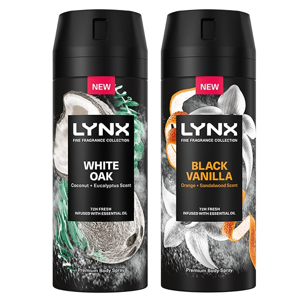 Includes: Lynx Fine Fragrance Premium Bodyspray Black Vanilla 150ml Lynx Fine Fragrance Premium Bodyspray White Oak 150ml