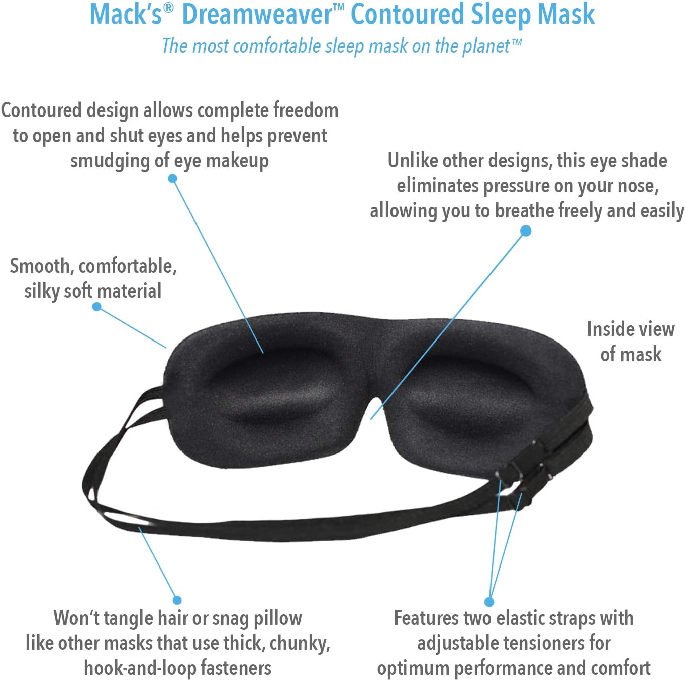 The most comfortable sleep mask on the planet! The contoured design prevents the eye mask from pressing against eyelids and eyelashes (wonât smudge makeup) while keeping the wearer comfortable inside a curtain of darknessSo light and slim, youâll hardly know youâre wearing it. Wake up relaxed, rested and refreshed. Made of high quality, soft, silky-smooth, breathable, satin-like material. Lightweight and super comfortable. Works with most CPAP facial masksFeatures dual elastic straps with adjustable tensioners for optimum performance and comfort. Fits men, women and kids. Wonât tangle hair or snag pillow like other masks that use thick, chunky, hook-and-loop fastenersIdeal for those suffering from insomnia or migraine headaches. Comfortable for all sleeping positions (side sleepers, back sleepers, stomach sleepers)Unlike other designs, this eye shade eliminates pressure on your nose, so that you can breathe freely and easily. Block out light without the claustrophobic and suffocating feeling. The natural sleep solution. Great for air travel, daytime sleep, meditation, night shift workers, napping, etc. Includes 1 pair of Mackâs Ultra Soft Foam Ear Plugs and storage pouchContoured design allows complete freedom to open and shut the eyes while keeping the wearer comfortable inside a curtain of darkness. So light and slim, you'll hardly know you're wearing it. Dual, adjustable straps accommodate heads of all sizes. Great for air travel, daytime sleep etc. Free pair of Mack's Ultra Soft Foam Earplugs and convenient travel pouch included