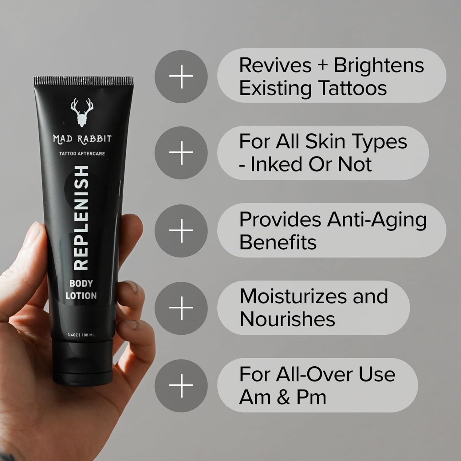 Mad Rabbit Replenish Tattoo Body Lotion - Fragrance-Free Lotion, Non-Greasy & Silicone-Free, Clean Ingredients, Lightweight For Daily Use (9.5 Ounce)