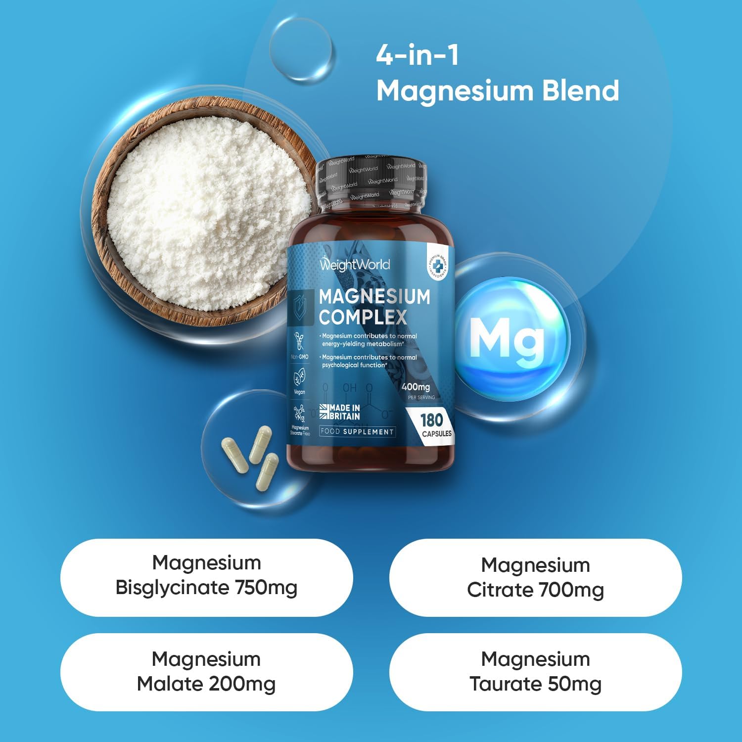 Magnesium Glycinate 4-In-1 Complex | 180 Capsules | 400Mg Elemental Magnesium Per Serving | 3 Months Supply | With Citrate, Bisglycinate, Taurate & Malate | Vegan & Non-Gmo | Made In Britain