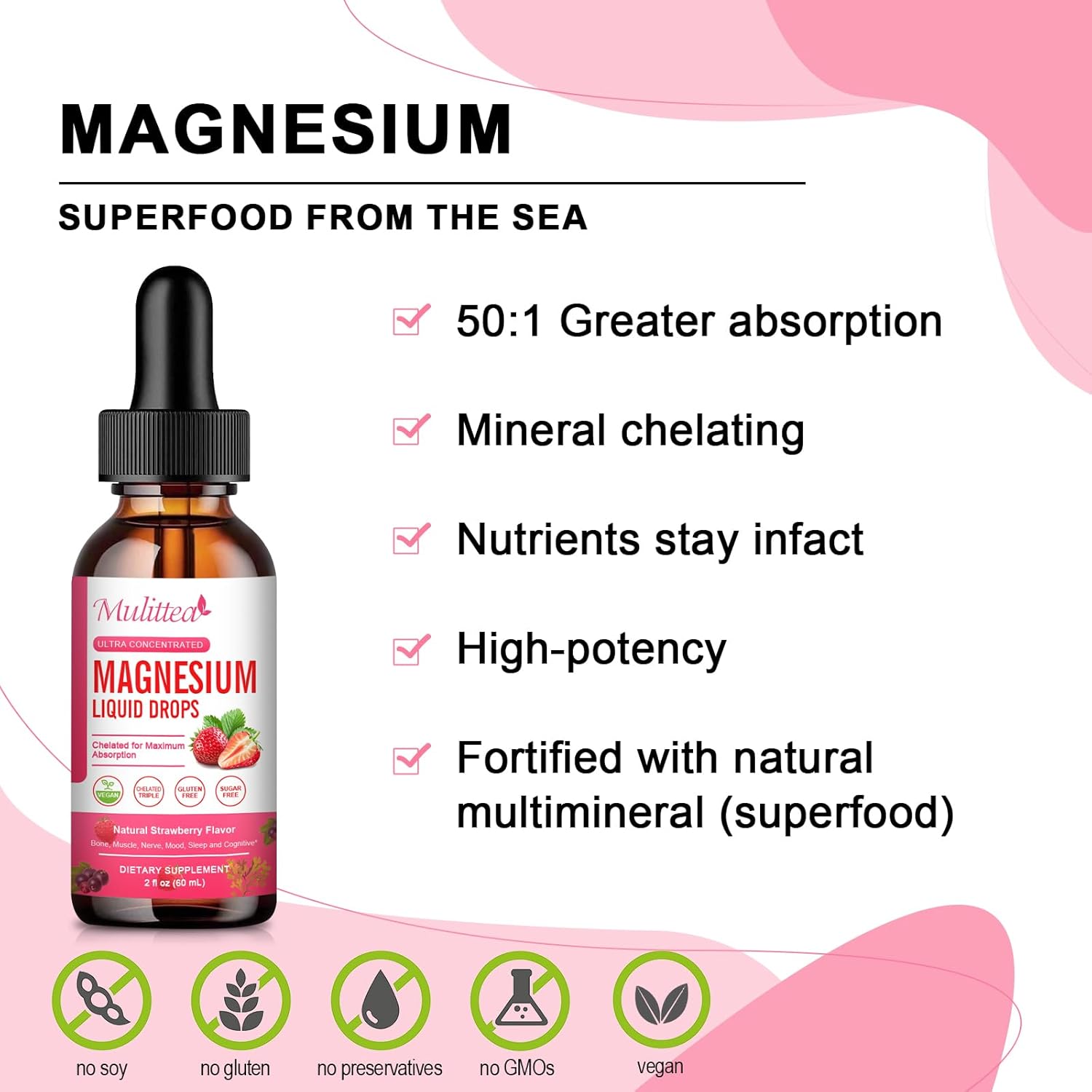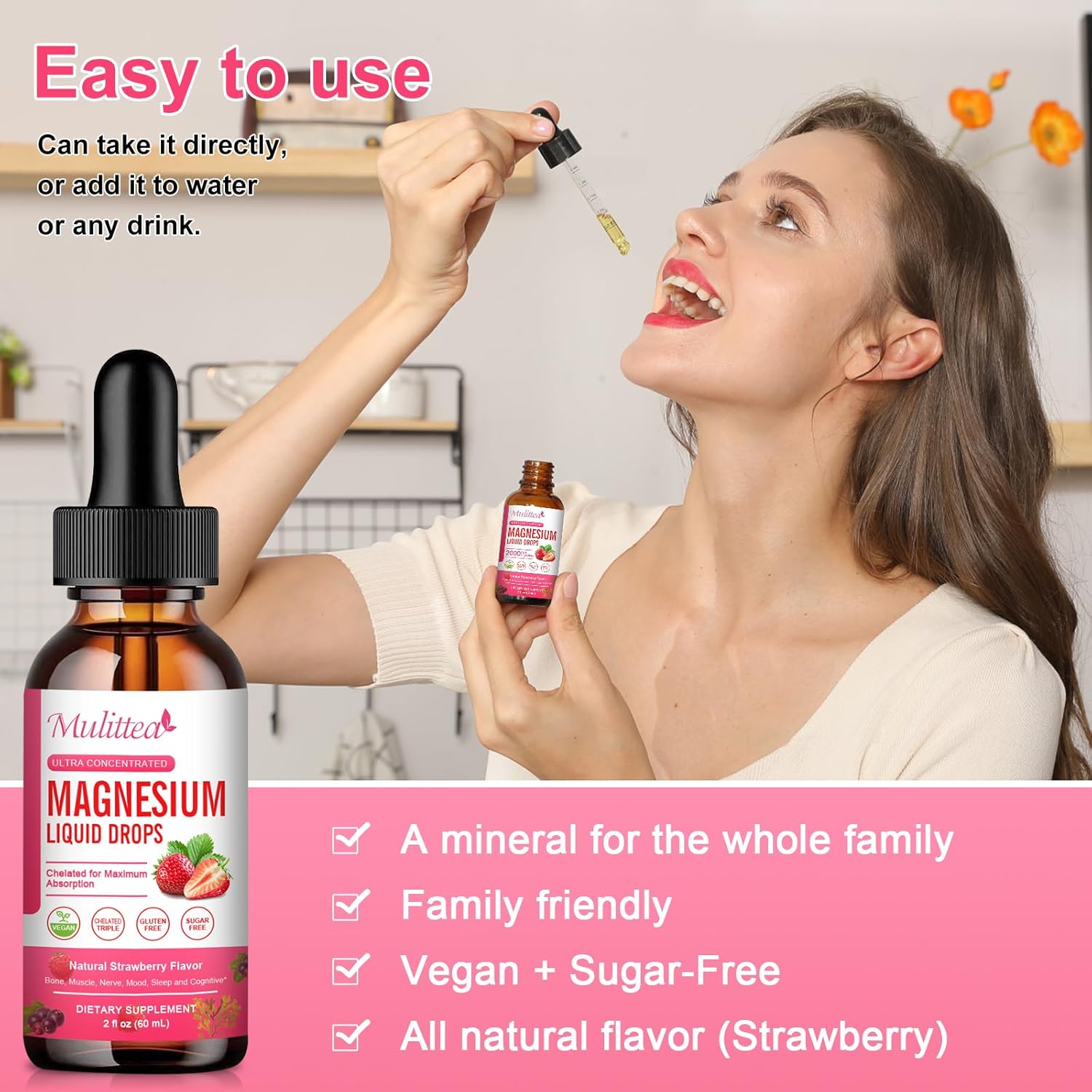 About this item 100 % Natural, Vegetarian Ingredients:Our Magnesium products are non-GMO and free of gluten,eggs, peanuts,fish/shellfish,fillers & sugar-free Maximum Potency Magnesium Complex ?Formulated combines High POTENT triple Magnesium Glycinate(bis),Citrate and more) Each is chelate or highly absorbable for maximum bioavailability and with natural whole food nutrients to synergistic increase the effectiveness which is the easiest form of magnesium for the body to absorb in which to helps you reap its benefits more Extra Strength: Our Triple Complex Elemental Magnesium with Vitamin D, K, B6,, L-Glutathione,L-Theanine to synergistic increase the effectiveness,night, stress support and help manage energy levels which impact mood, and better relaxation& ZZZ Well-Rounded, Essential Daily Support:Mulittea delicious Magnesium Complex Liquid is an easy-to-take liquid vitamin for women, men, and children. Receive the benefits of these minerals vitamins, amino acids, and other vegan nutrients for immune support, help manage energy levels etc Easy-To-Take Liquid for Women, Men, and Kids: No more hard-to-swallow capsules! Shake well before use. Can take it directly, or add it to water or any drink for most lifestyles. Family Friendly DIRECTION?Take Up to 2ml vegan drops daily, and use a graduated dropper to take four half droppers?1 half droppers=0.5ml? โบ See more product details,100 % Natural, Vegetarian Ingredients:Our Magnesium products are non-GMO and free of gluten,eggs, peanuts,fish/shellfish,fillers & sugar-free,Maximum Potency Magnesium Complex ?Formulated combines High POTENT triple Magnesium Glycinate(bis),Citrate and more) Each is chelate or highly absorbable for maximum bioavailability and with natural whole food nutrients to synergistic increase the effectiveness which is the easiest form of magnesium for the body to absorb in which to helps you reap its benefits more,Extra Strength: Our Triple Complex Elemental Magnesium with Vitamin D, K, B6,, L-Glutathione,L-Theanine to synergistic increase the effectiveness,night, stress support and help manage energy levels which impact mood, and better relaxation& ZZZ,Well-Rounded, Essential Daily Support:Mulittea delicious Magnesium Complex Liquid is an easy-to-take liquid vitamin for women, men, and children. Receive the benefits of these minerals vitamins, amino acids, and other vegan nutrients for immune support, help manage energy levels etc,Easy-To-Take Liquid for Women, Men, and Kids: No more hard-to-swallow capsules! Shake well before use. Can take it directly, or add it to water or any drink for most lifestyles. Family Friendly,DIRECTION?Take Up to 2ml vegan drops daily, and use a graduated dropper to take four half droppers?1 half droppers=0.5ml?