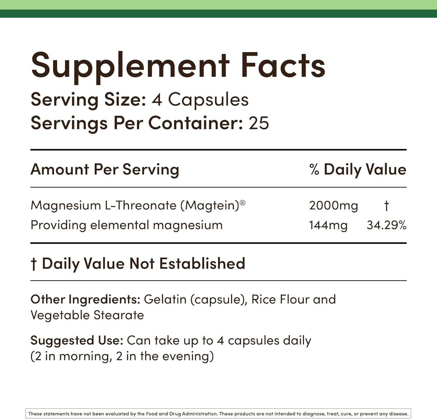Magnesium L Threonate Capsules (Magtein) – High Absorption Supplement – Bioavailable Form For Sleep And Cognitive Function Support – 2,000 Mg – 100 Capsules