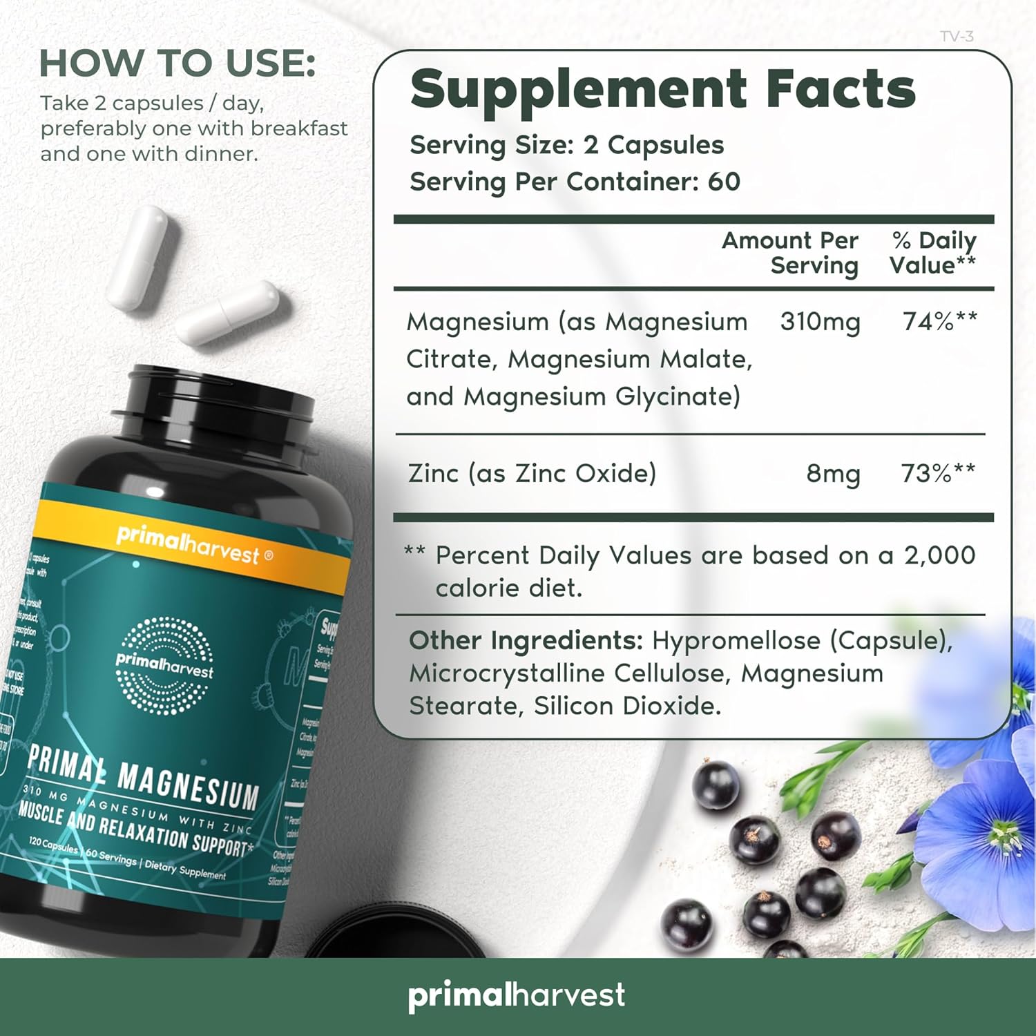 Magnesium Supplement Complex 310Mg By Primal Harvest With Magnesium Glycinate, Citrate, Malate, And Zinc 120 Capsules