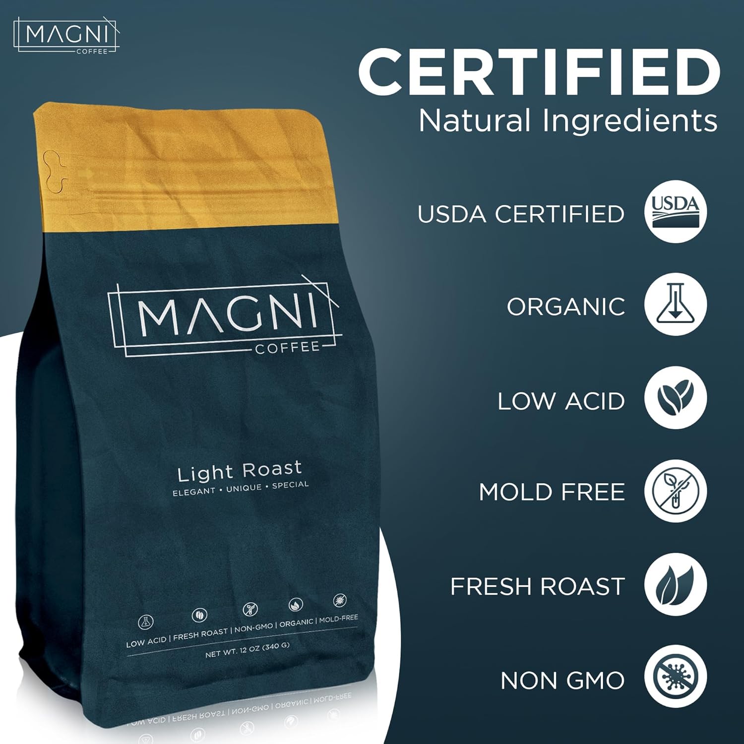 Magni Coffee - Ground - Light Roast - Low Acid - Single Origin Usda Organic Non-Gmo Beans Third Party Tested For Mycotoxins & Pesticides - Fair Trade -12 Oz