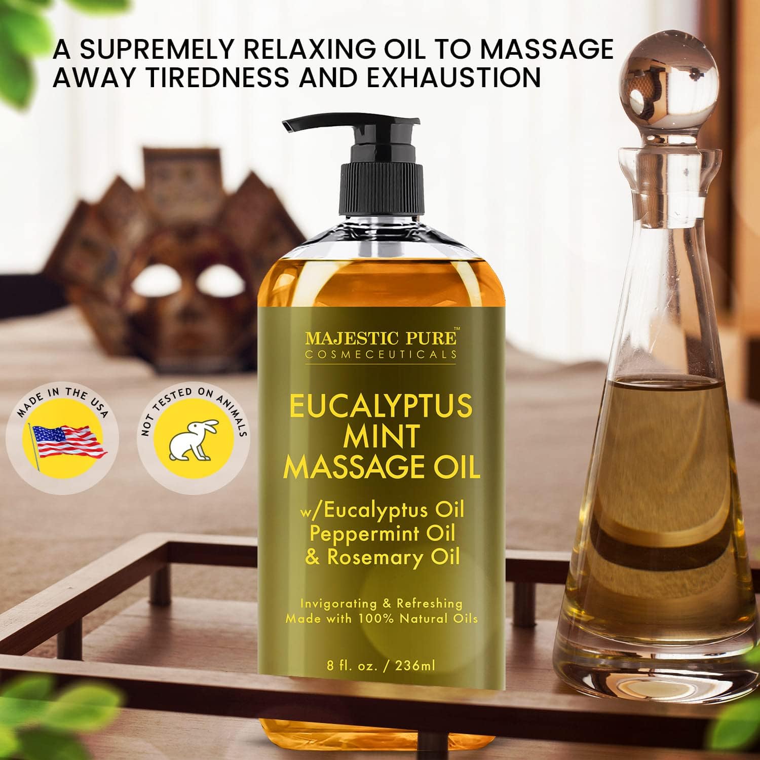 Majestic Pure Eucalyptus Mint Massage Oil - Invigorating, Refreshing, And Relaxing - Massage, Made With Natural Oils - For All Skin Types - Men And Women - Made In Usa - 8 Fl Oz