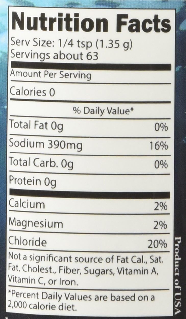 Mineral-rich sea water is naturally derived from 2,000 feet below the surface of the ocean and remains untouched and pure through its transformation into sea salt. This remarkable deep sea salt is harvested using a sustainable, proprietary method which leaves vital minerals intact and produces a salt that is naturally 33% lower in sodium than table salt. 3.1 oz with built-in grinder.