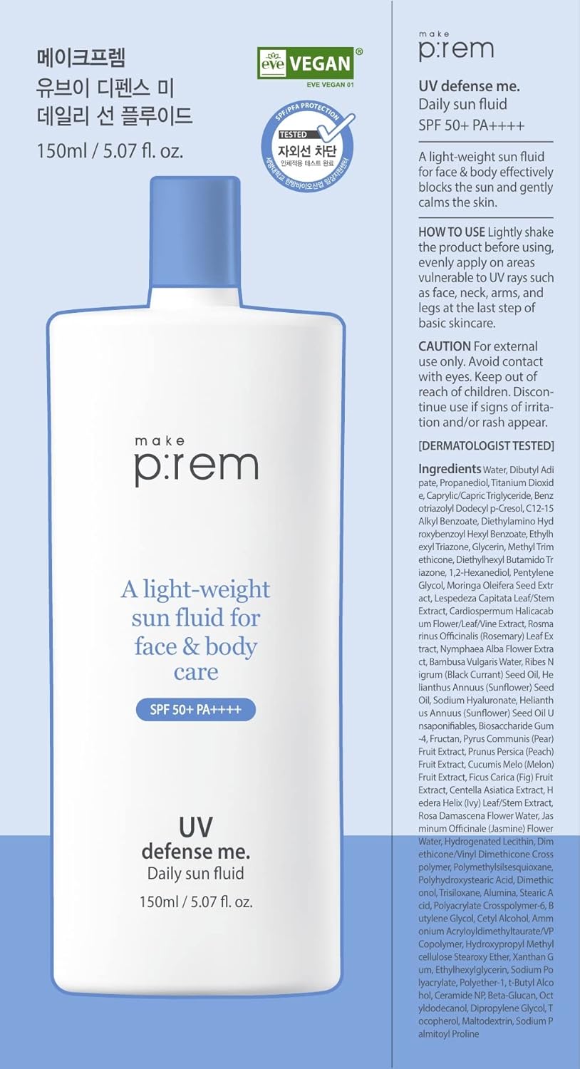 Makeprem Defense Me Daily Vegan Sun Fluid Non-Greasy Calming Hydrating Spf 50+Pa++++ Sunblock Reef-Safe Uv Broad Protection Sunscreen Blue Ray Sensitive Acne-Prone Oily Skin Face Body Korean Skincare