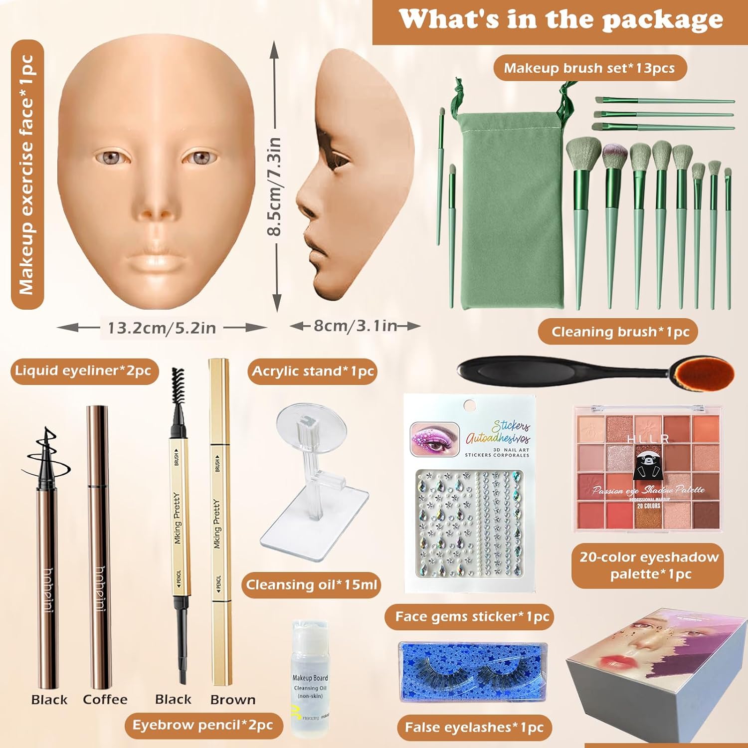 Makeup Practice Board SetComes With 1Pc Silicone Makeup Mannequin Face Measures 7.28 X 5.2 X 3.15 Inches (L X W X H), A Eye Shadow Palette Of 20 Colors, A Makeup Brush Set Of 13 Brushes, 1 Pair Of False Eyelashes, 2 Liquid Eyeliners, 2 Eyebrow Pencils, 1 Foundation Brush, 1 Sheet Face Gemstone Patch And 1 Bottle Of Cleansing Oil