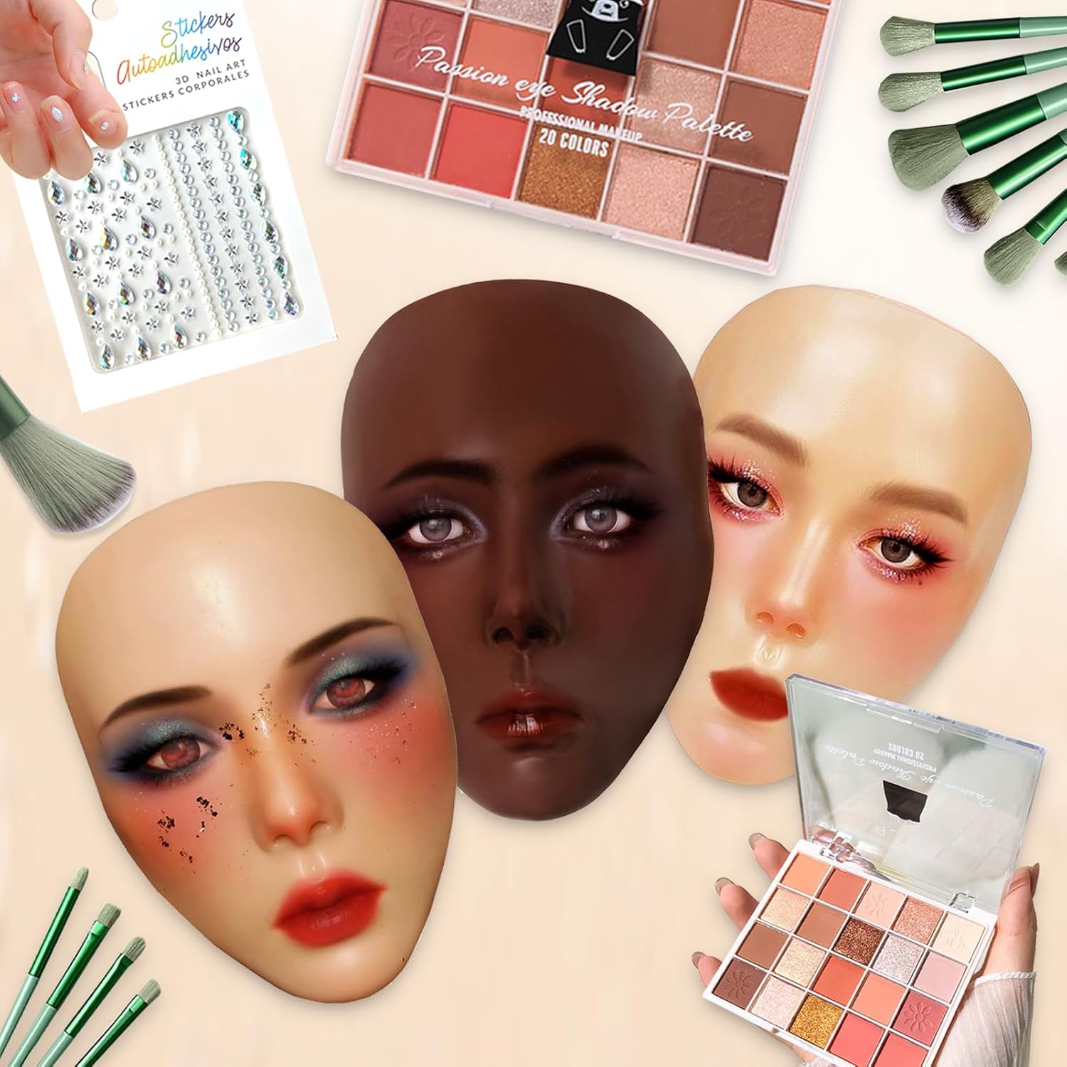 Makeup Mannequin Face Kit, Silicone Makeup Practice Full Face For Must Haves, Mannequin Face For Makeup Practice With Makeup Brushes Set & Eye Shadow & Eyebrow Pencil-Bright
