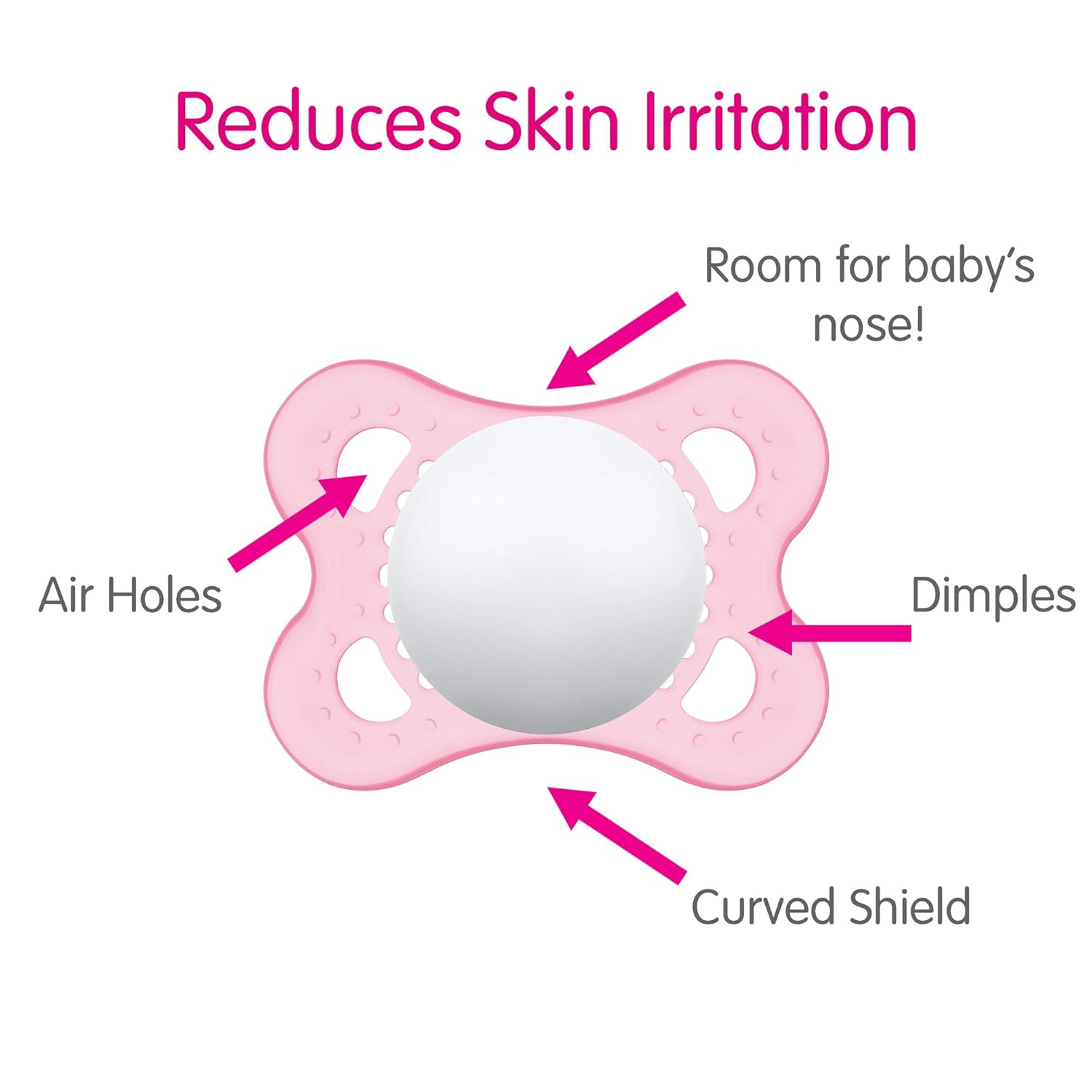 Product 1: SYMMETRICAL SHAPE PACIFIER: Our MAM pacifiers for breastfed babies have a symmetrical silicone nipple so that they are always right-side up and fuss free to stay in your baby's mouth,Product 1: SILICONE PACIFIER - The BPA-free silicone nipple has the signature MAM breastfeed pacifier design, with silky SkinSoft material and a symmetrical shape that's ideal for jaw and teeth development,Product 1: PACIFIER FOR 0-6 MONTHS: Our silicone pacifier nipple is designed by parents and medical experts that is BPA and latex free, while proving skin-like texture, with fun and functional plain designs,Product 1: VENTILATED & COMFORTABLE SHIELD: These cute pacifiers for babies have a curved sterilizing shield with openings to keep baby comfortable, prevent moisture build-up, and allow baby’s skin to breathe,Product 2: GLOWS IN THE DARK: These night pacifiers for baby glow in the dark, making it easy for you to locate quickly at night without any stumbling and searching, so your baby can sleep better,Product 2: SYMMETRICAL DESIGN: The breastfeed pacifier for babies is fun and functional. The curved shield with wide openings are always right-side up and prevent skin irritation with maximum airflow,Product 2: SILICONE NIPPLE: The BPA-free silicone boy and girl pacifier has the signature MAM design, with silky SkinSoft material and a symmetrical shape that's ideal for jaw and teeth development,Product 2: SELF - STERILIZING CASE: Add water and pop into the microwave to sterilize MAM silicone pacifiers 0-6 months in just 3 minutes and store in case for at home and travel to protect the pacifiers