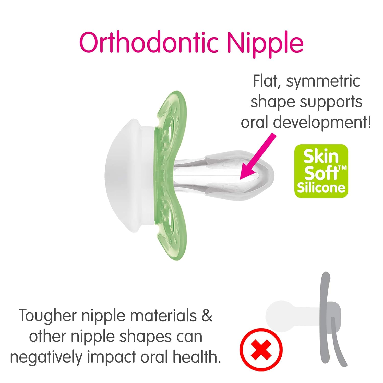PACIFIER FOR 0-6 MONTHS: Our silicone pacifier nipple is designed by parents and medical experts that is BPA and latex free, while proving skin-like texture, with fun and functional plain designs