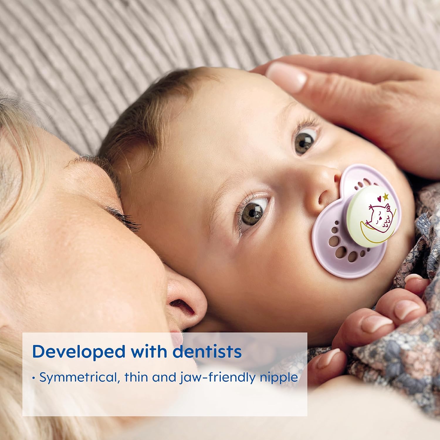 GLOWS IN THE DARK: Two night pacifiers glow in the dark, making it easy for you to locate quickly at night without any stumbling and searching, helping your baby sleep better