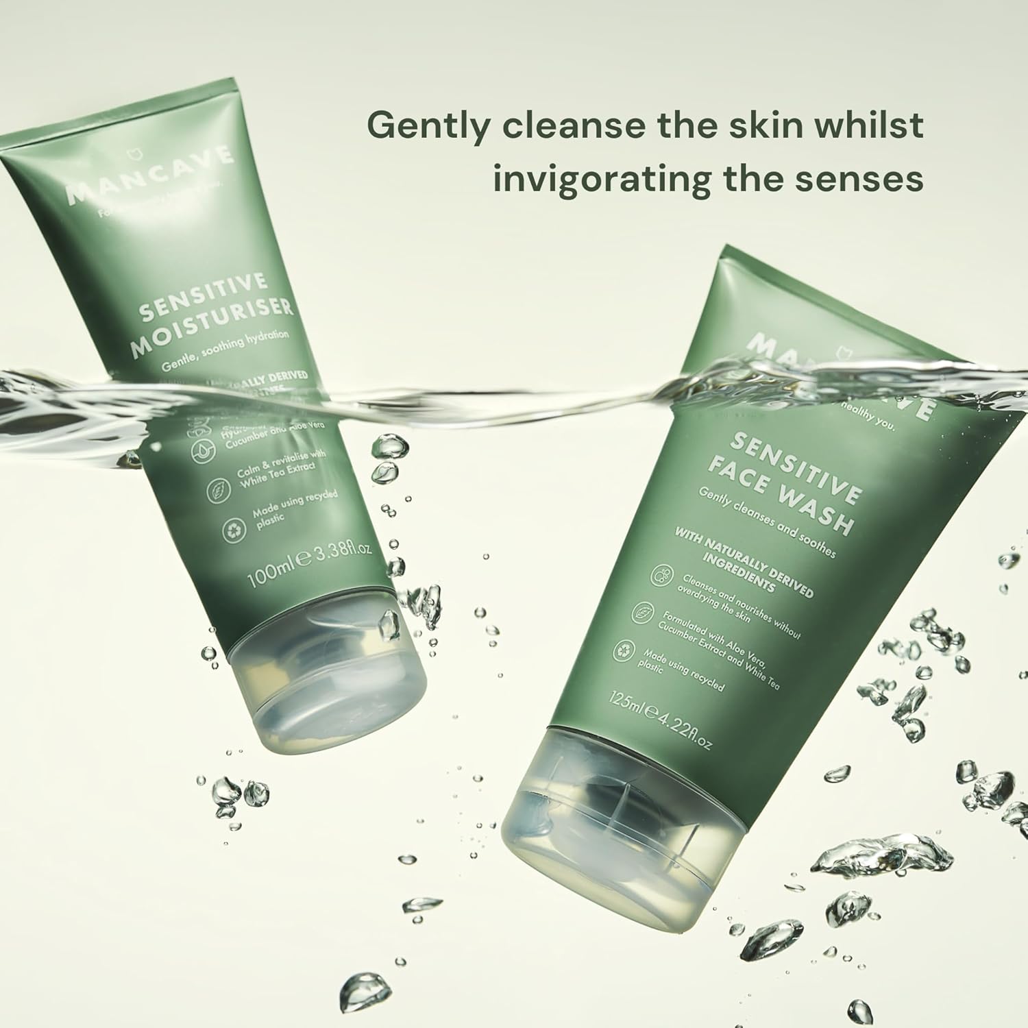 Mancave Sensitive Skin & Body Gift Set, Face Wash, Moisturiser, Shower Gel, Dermatologically Tested, Natural Formulations, Ideal For Travel, Vegan, Made In England, Packaging May Vary