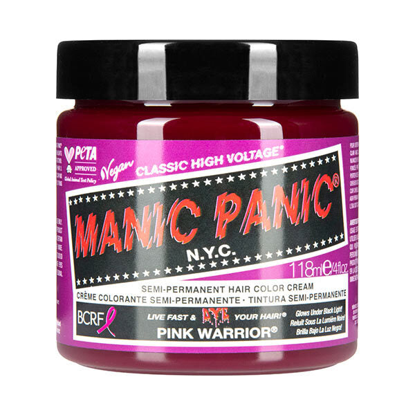 Product Information:Step into the world of pink with Manic Panic High Voltage Classic Colour Pink Warrior. A vegan and cruelty-free hair dye with a neon edge!,Features:100% vegan and cruelty-free. 98% conditioner, creates a soft and highly moisturised result. Tested on celebrities, not animals,Warning or Restrictions:For external use only. Keep out of reach of children. Product contains ingredients that may cause skin irritation; perform a preliminary patch test 24-48 hours before application to check for allergies or unexpected reactions. Do not use this product to dye eyebrows or eyelashes. If product gets into eyes, immediatly rinse well with water and consult a medical professional,Product Specification:Water (Aqua/Eau), Cetearyl Alcohol, Propylene Glycol, Distearoylethyl Hydroxyethylmonium Methosulfate, Ceteareth-20, Citric Acid, Formic Acid, Methylparaben, Basic Violet 16, Basic Violet 2, HC Yellow No 4, Basic Red 51,Product Uses:For best results, apply to a pre-lightened base. Wearing gloves, apply to clean and dry hair ensuring hair is thoroughly saturated. Cover hair with a plastic cap and leave to process for at least 30 minutes. Rinse hair in cold water until water runs clear