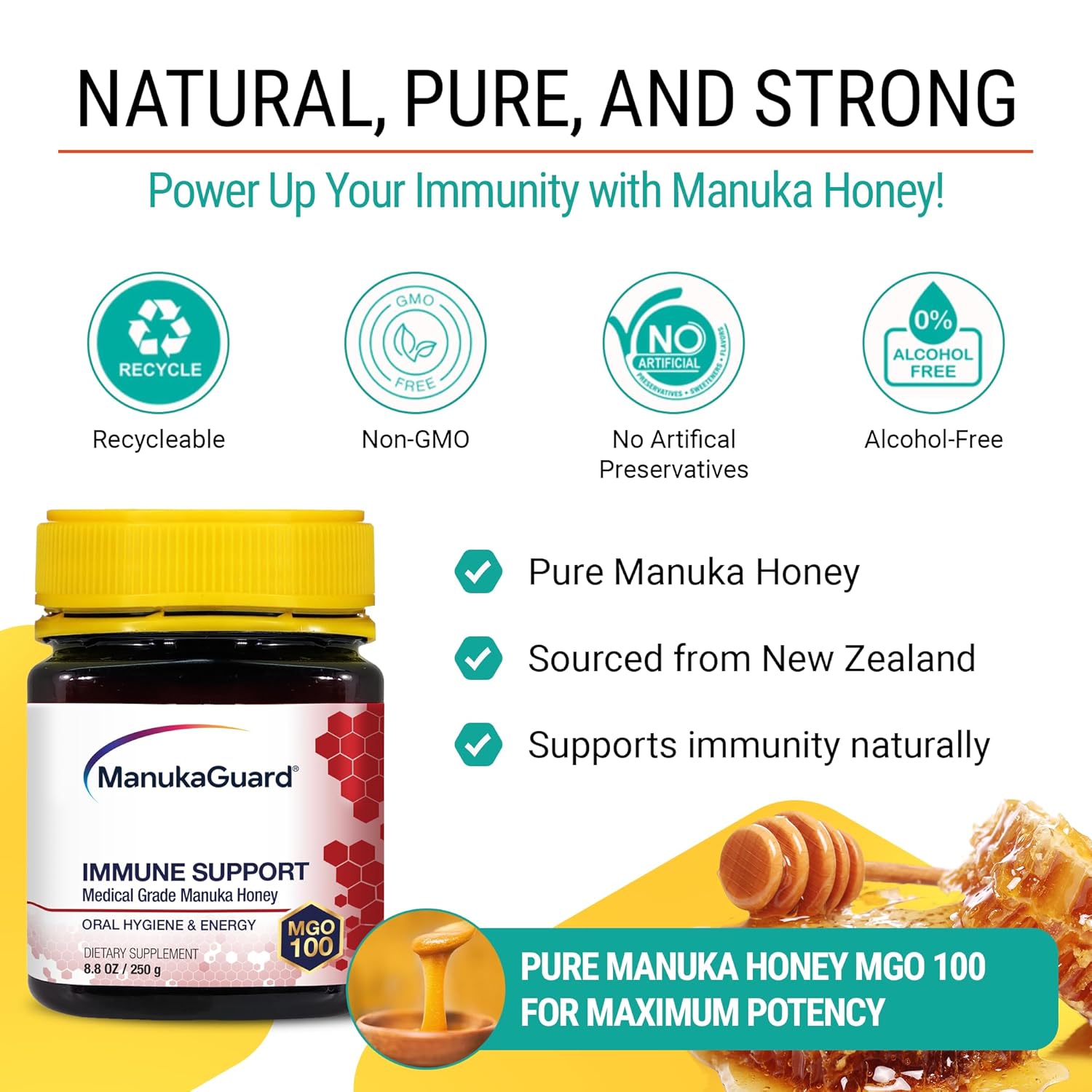 Manukaguard Immune Support Manuka Honey 8.8 Oz - Raw From New Zealand Mgo 100 - Skin Care, Immune System Support, Cough, Digestive & Respiratory Health