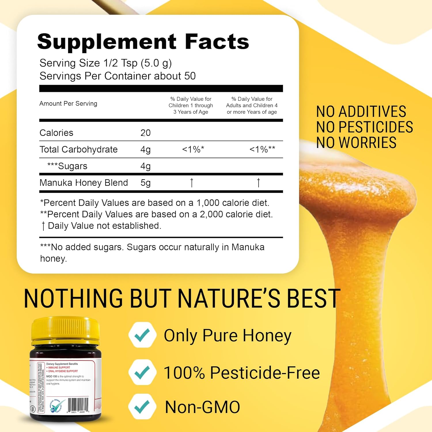 About this item NEW ZEALAND MANUKA HONEY - 100% RAW MGO 100+ Don't be fooled by high MGO content. The source, purity, and quality of the honey is the most important factor to getting the amazing health benefits that Manuka honey has to offer. Our farms are monofloral, meaning thereās no cross pollination with other plants, resulting in the purest and highest quality active Manuka Honey available. FROM HIVE TO HOME - Traceable from the hive to your home, our bees extract sweet nectar from Leptospermum plants growing in Masterton, New Zealand. The natural honey from these shrubs has unique healing properties not found in other honeys. Extracting at low temperatures helps keep the raw manuka honey in its natural state, offering a more bioactive honey with a wide range of health benefits. BETTER THAN A CURE - Instead of curing disease and sickness, the ultimate would be to not get sick in the first place. Eaten everyday, Manuka honey helps build a healthy immune system. Not only does manuka honey boost immune system, it contains hundreds of probiotics, vitamins, minerals, and amino acids to support total body health. UNPASTEURIZED & NON-GMO - We believe the best honey is raw and unpasteurized. ManukaGuard brings you 100% Authentic Manuka Honey from New Zealand āŗ See more product details,NEW ZEALAND MANUKA HONEY - 100% RAW MGO 100+ Don't be fooled by high MGO content. The source, purity, and quality of the honey is the most important factor to getting the amazing health benefits that Manuka honey has to offer. Our farms are monofloral, meaning thereās no cross pollination with other plants, resulting in the purest and highest quality active Manuka Honey available,FROM HIVE TO HOME - Traceable from the hive to your home, our bees extract sweet nectar from Leptospermum plants growing in Masterton, New Zealand. The natural honey from these shrubs has unique healing properties not found in other honeys. Extracting at low temperatures helps keep the raw manuka honey in its natural state, offering a more bioactive honey with a wide range of health benefits,BETTER THAN A CURE - Instead of curing disease and sickness, the ultimate would be to not get sick in the first place. Eaten everyday, Manuka honey helps build a healthy immune system. Not only does manuka honey boost immune system, it contains hundreds of probiotics, vitamins, minerals, and amino acids to support total body health,UNPASTEURIZED & NON-GMO - We believe the best honey is raw and unpasteurized. ManukaGuard brings you 100% Authentic Manuka Honey from New Zealand
