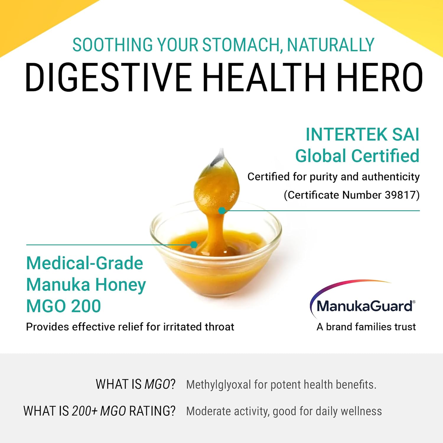 MANUKA HONEY MGO 200: MGO (methylglyoxal) is a naturally occurring compound that makes Manuka Honey a powerful product. And every jar of our Medical Grade Manuka Honey is tried and verified for natural MGO content. Our Manuka Honey MGO 200 Throat Support helps to calm throat discomfort