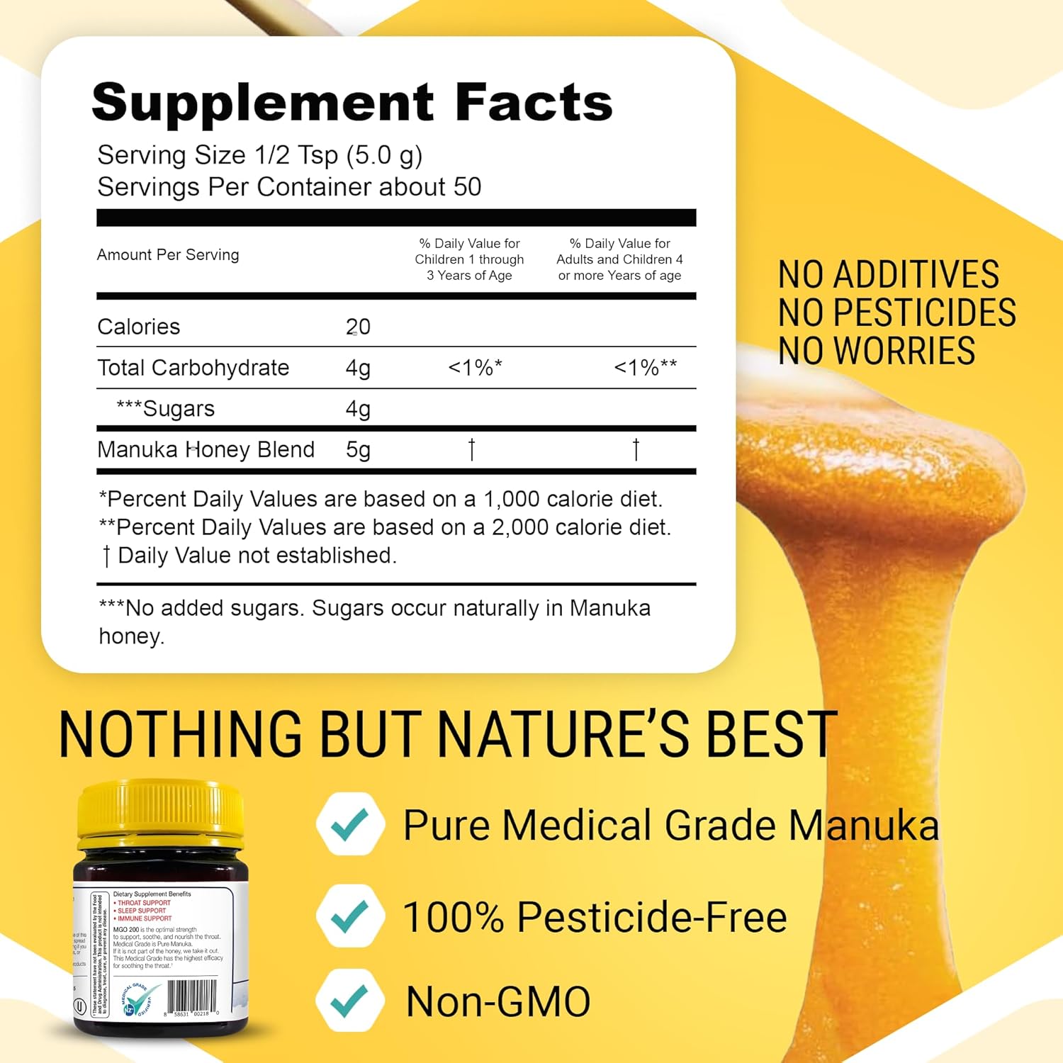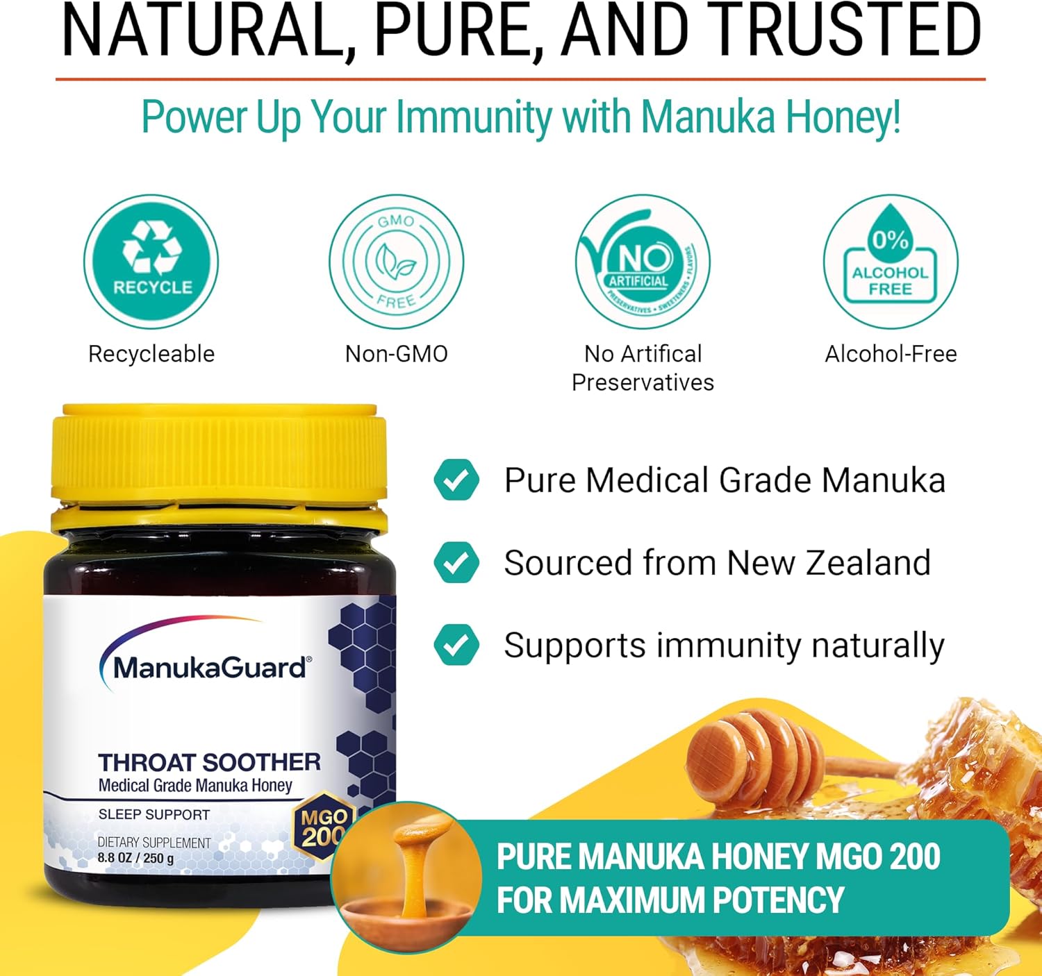 About this item MANUKA HONEY THROAT SUPPORT: ManukaGuard’s Throat Support Honey provides optimal strength to help reduce dry throats, hoarseness and throat irritation caused by outside factors. MANUKA HONEY MGO 200: MGO (methylglyoxal) is a naturally occurring compound that makes Manuka Honey a powerful product. And every jar of our Medical Grade Manuka Honey is tried and verified for natural MGO content. Our Manuka Honey MGO 200 Throat Support helps to calm throat discomfort. WHEN TO USE: Use our Manuka Honey Throat Support when you feel the need to hydrate and relax your throat. This honey can be used everyday as part of your regular wellness routine, try it in your morning or afternoon tea! SUPPORTS NATIVE MAORI OF NEW ZEALAND: The New Zealand Maori own and control the bulk of the lands from which our honey is harvested. Therefore, acquiring our Manuka Honey products helps to economically support the Maori. FROM OUR FAMILIES TO YOURS: ManukaGuard deeply cares about our customers and your families. We genuinely want to ensure you have a great experience with our products. We work diligently to create the highest quality products, so if you have any issues please reach out and we’ll make it right. › See more product details,MANUKA HONEY THROAT SUPPORT: ManukaGuard’s Throat Support Honey provides optimal strength to help reduce dry throats, hoarseness and throat irritation caused by outside factors,MANUKA HONEY MGO 200: MGO (methylglyoxal) is a naturally occurring compound that makes Manuka Honey a powerful product. And every jar of our Medical Grade Manuka Honey is tried and verified for natural MGO content. Our Manuka Honey MGO 200 Throat Support helps to calm throat discomfort,WHEN TO USE: Use our Manuka Honey Throat Support when you feel the need to hydrate and relax your throat. This honey can be used everyday as part of your regular wellness routine, try it in your morning or afternoon tea!,SUPPORTS NATIVE MAORI OF NEW ZEALAND: The New Zealand Maori own and control the bulk of the lands from which our honey is harvested. Therefore, acquiring our Manuka Honey products helps to economically support the Maori,FROM OUR FAMILIES TO YOURS: ManukaGuard deeply cares about our customers and your families. We genuinely want to ensure you have a great experience with our products. We work diligently to create the highest quality products, so if you have any issues please reach out and we’ll make it right