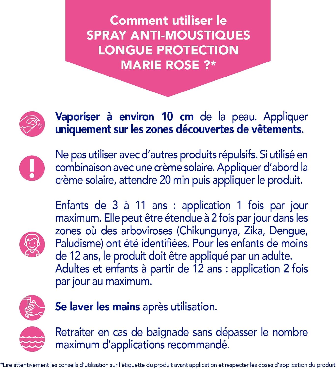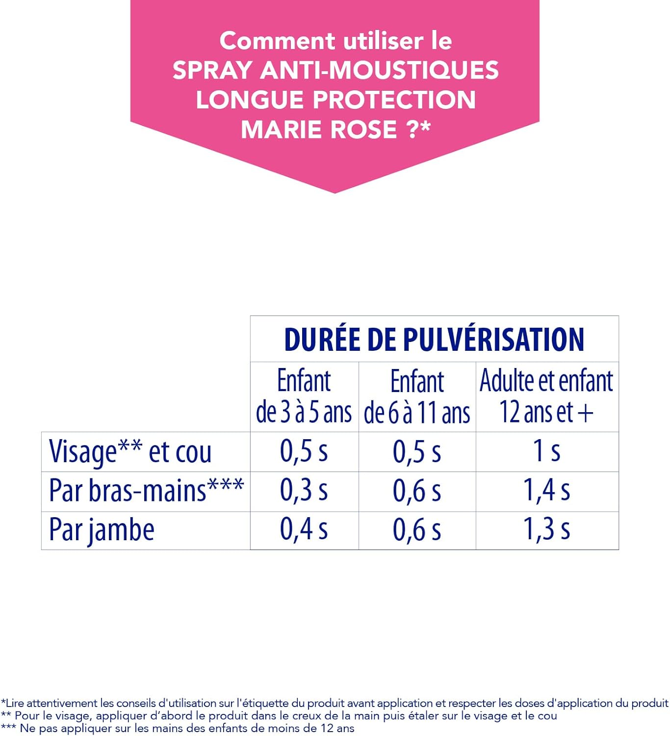 About this item Long-lasting: Marie Rose long-lasting mosquito repellent spray protects you effectively for 7 hours* Mosquito protection: this long-lasting Marie Rose spray protects you from the aggression of mosquitoes, tiger mosquitoes and sand flies FAMILY: Use from 3 years old MANUFACTURING: Made in Europe Instructions for use: Read the label carefully before use and follow all instructions indicated. Respect the doses of application of the product. Do not use with other repellents. Spray approximately 10 cm from the skin. Apply only to open areas of clothing. For children under 12 years of age, the product must be applied by an adult. › See more product details,Long-lasting: Marie Rose long-lasting mosquito repellent spray protects you effectively for 7 hours,Mosquito protection: this long-lasting Marie Rose spray protects you from the aggression of mosquitoes, tiger mosquitoes and sand flies,FAMILY: Use from 3 years old,MANUFACTURING: Made in Europe,Instructions for use: Read the label carefully before use and follow all instructions indicated. Respect the doses of application of the product. Do not use with other repellents. Spray approximately 10 cm from the skin. Apply only to open areas of clothing. For children under 12 years of age, the product must be applied by an adult
