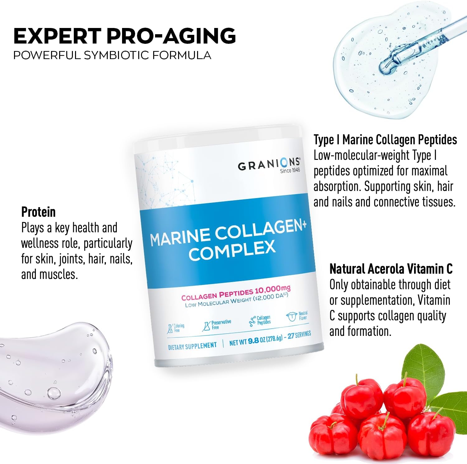 About this item REVITALIZING AGE DEFENSE for youthful skin, and hair, nails & joints support. Nourishing 10,000mg Marine Collagen peptides complex plus free radical antioxidant Acerola Vitamin C for optimal benefits. REPLENISH & STIMULATE COLLAGEN FORMATION. 10g of absorption-optimized low molecular weight Type I Hydrolyzed Collagen Peptides. Stimulates natural collagen production and supports existing stores. HOLISTIC SUPPORT. Collagen without Vitamin C leads to weak connective tissue. Unlike standard deep marine collagen supplements this powerful collagen drink includes natural Acerola Vitamin C. QUICK, EASY, AND ZERO FLAVOR. Simply mix 2-scoops of Granions unflavored collagen powder into a drink each day. It dissolves fast, and is absorbed up to 98% faster than collagen tablets or capsules. PREMIUM QUALITY AND SAFETY COLLAGEN COMPLEX. Manufactured in CGMP facilities with trusted, Doctor-formulated structual protein, and health and beauty ingredients. Neutral flavor, no after-taste, and coloring-free. TRUSTED BY GENERATIONS SINCE 1948 β Granions combines over 75 years of pharmaceutical expertise with rigorous quality standards to deliver supplements backed by science and tradition. Your Wellness is in Our Nature. See more product details,REVITALIZING AGE DEFENSE for youthful skin, and hair, nails & joints support. Nourishing 10,000mg Marine Collagen peptides complex plus free radical antioxidant Acerola Vitamin C for optimal benefits,REPLENISH & STIMULATE COLLAGEN FORMATION. 10g of absorption-optimized low molecular weight Type I Hydrolyzed Collagen Peptides. Stimulates natural collagen production and supports existing stores,HOLISTIC SUPPORT. Collagen without Vitamin C leads to weak connective tissue. Unlike standard deep marine collagen supplements this powerful collagen drink includes natural Acerola Vitamin C,QUICK, EASY, AND ZERO FLAVOR. Simply mix 2-scoops of Granions unflavored collagen powder into a drink each day. It dissolves fast, and is absorbed up to 98% faster than collagen tablets or capsules,PREMIUM QUALITY AND SAFETY COLLAGEN COMPLEX. Manufactured in CGMP facilities with trusted, Doctor-formulated structual protein, and health and beauty ingredients. Neutral flavor, no after-taste, and coloring-free,TRUSTED BY GENERATIONS SINCE 1948 β Granions combines over 75 years of pharmaceutical expertise with rigorous quality standards to deliver supplements backed by science and tradition. Your Wellness is in Our Nature