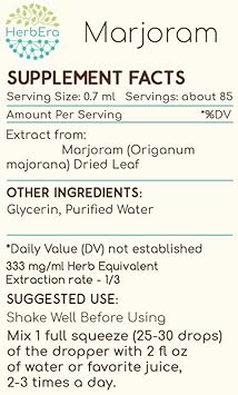 Liquid Herbal Extract. At Herbera our extracts are formulated for premium quality and time-tested dependability. Potent 1:3 herb to solvent ratios guarantee that all the qualities of the herb are fully protected, this is achieved through hyper raw-extraction and cold-processing technology. Through paramount research we take premium grade herbs from global suppliers and use unparalleled menstruum ratios to extract high bio-active compounds that exceed expectations. We prioritize facilities, clean areas around the world and modern means of production each step of the way. With you in mind we remain at the forefront of health science. Suggested Use: Adults take 30-50 drops of extract in a small amount of water or choice beverage 2-4 times daily between meals. Other Ingredients: Glycerin Distilled Water. Warnings: Shake well before using. Not to be used during pregnancy or lactation. If you have a medical condition or take medications, please consult with your doctor before use. Keep out of reach of children. Use only as directed on label. Safety-sealed for your protection,Marjoram (Origanum majorana) Dried Leaf,100% Natural Product: No Artificial Colors or Flavors,MADE AND TESTED IN THE USA,Carefully crafted from a potent source