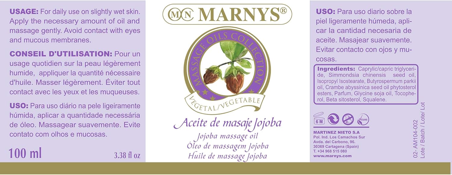 ?? 100% VEGETAL MASSAGE OIL. Jojoba MARNYS massage oil has been formulated with emollient oils of jojoba, crambe, vegetable sterols and shea to nourish, soften and moisturize the skin