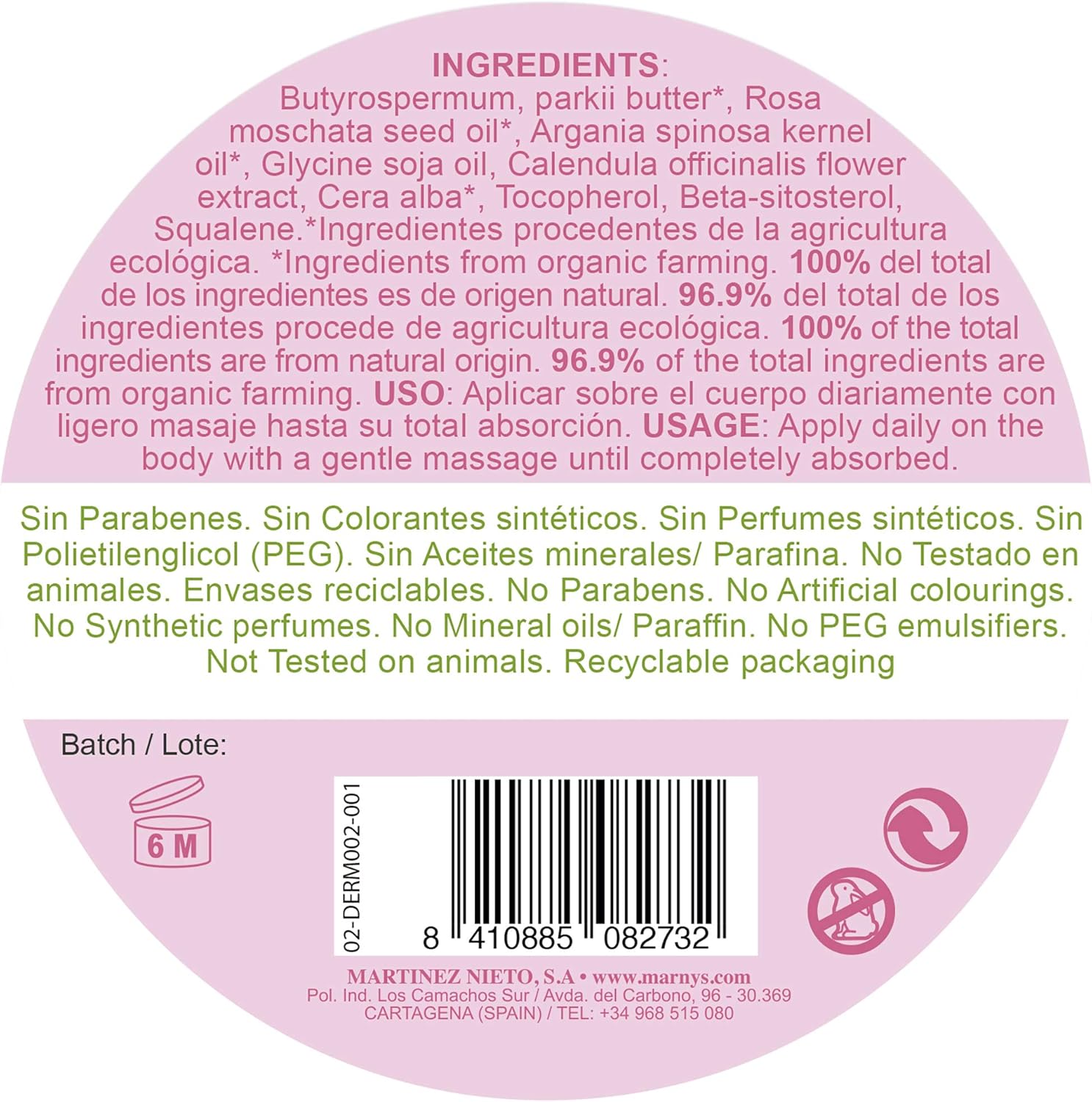 Product Description Marnys DERMPURE Organic Marigold and Argan Rose Hip Shea Butter is special for regenerating, soothing and moisturizing the skin. Ingredients Shea Butter*, Rosehip Oil*, Argan Oil*, Calendula Extract. *Ingredients from organic farming. 100% of the total ingredients are of natural origin. 96.9% of the total ingredients come from organic farming,?? 100% NATURAL ORGANIC BUTTER Marnys DERMPURE Organic Marigold and Argan Rose Hip Shea Butter is 100% natural and 96.9% BIO. Suitable for all skin types, especially sensitive skin, and will not clog pores,?? REGENERATES, SOOTHES AND MOISTURIZES THE SKIN. It is specially formulated to regenerate, soothe and moisturize the skin. Provides extra hydration and repair of the body and face,?? STRETCH, SCAR AND WRINKLES Improves the appearance of stretch marks, scars and wrinkles, while maintaining the skin's natural barrier function,?? A HYDRATION PLUS Helps in skin nutrition easy application and fast absorption. At room temperature it is in a solid state, melt on the palm of the hand and apply it to the desired area,?? HYDRATED AND RADIANT SKIN It can be applied before makeup, to achieve a more hydrated and radiant skin or on wet or dry skin as complementary to daily hydration