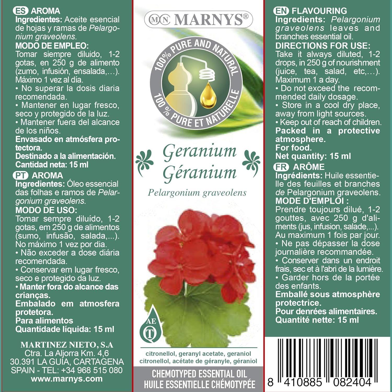 ?? FRUITED FLAVOR CHARACTERISTIC. MARNYS Geranium Essential Oil contains chemotypes: citronellol, geranil acetate, geraniol, its color and appearance from colorless to pale yellow, with characteristic fruity flavor, properties that favor the food taste