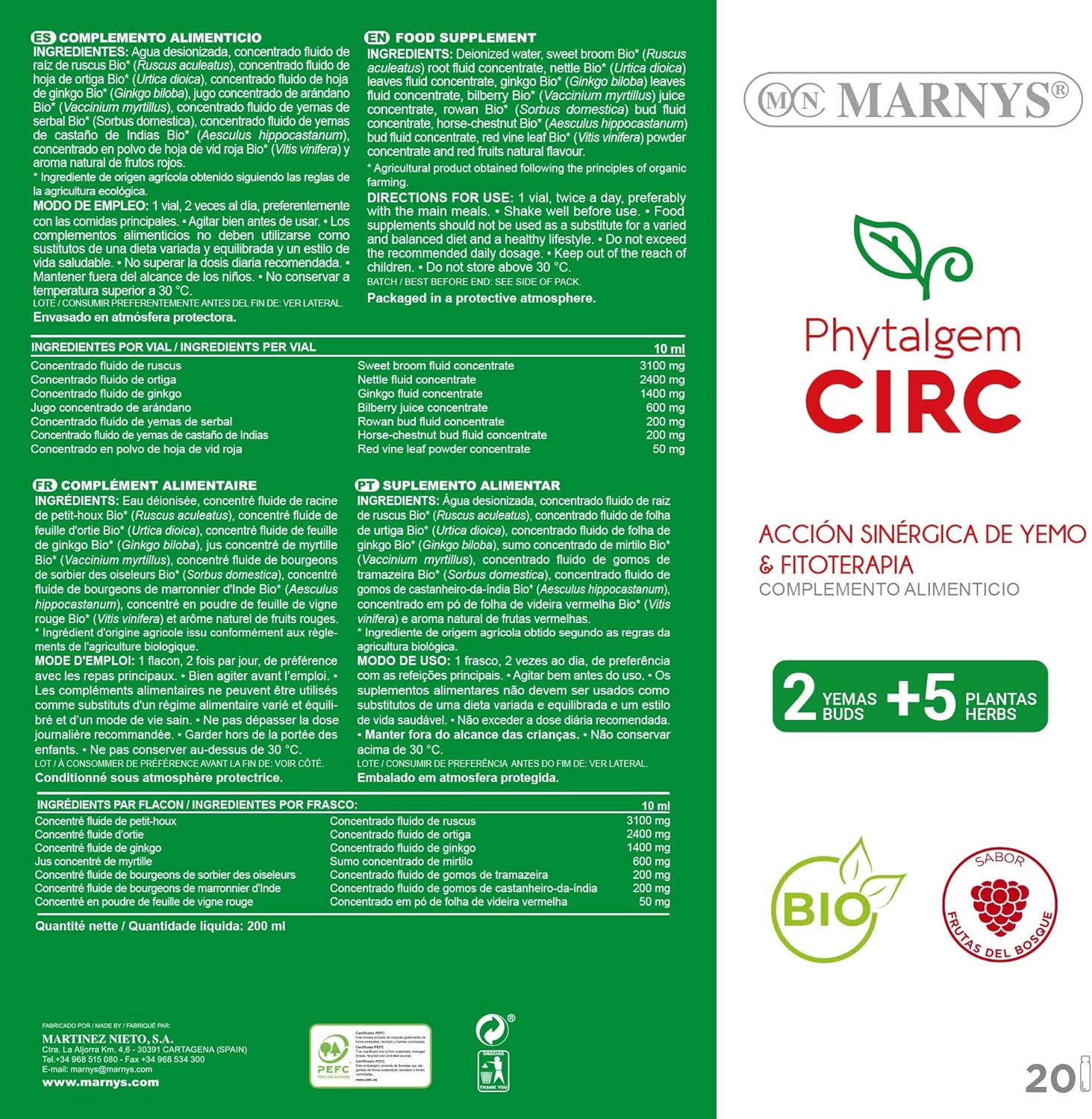 Product description Blood circulation in tired legs; Marnys Phytalgic Circus promotes blood circulation in tired legs thanks to the combination of ingredients such as blueberry and red willow. Organic ingredients; contains a selection of plants valued for their active ingredients, as well as organic circus berry juice, all from certified organic cultivation. Normal blood circulation; ideal for adults who have tired legs due to their lifestyle and for their normal blood circulation, relieve fatigue and heaviness in the legs; the properties of the cranberry contribute to blood circulation and reduce the feeling of fatigue and heaviness in the legs. Comfortable drinking bottles with fruit taste From the forest, the format in single dose bottles is convenient to take, safe and easy to transport Ingredients Deionised water, concentrate from the root liquid of the ruscus bio* (Ruscus aculeatus), liquid concentrate of nettle leaf* (Urtica dioica) liquid concentrate from Ginkgo Biloba Bio* (Ginkgo biloba), Serbalg Bio* (Sorbus Domestica) liquid concentrate of Indian egg yolks organic* ( Hipp Organic cranberry juice (Vaccinium myrtillus), concentrate of red wine powder* (Vitis Vinitfer) and natural fragrance of red fruits. * Ingredients of agricultural origin according to the rules of organic agriculture,Blood circulation for tired legs; Marnys phytalgem circus facilitates blood circulation in tired legs, thanks to the combination of ingredients, including blueberry and red willow,Ecological ingredients; contains a selection of plants valued in their active ingredients, in addition to organic cureberry juice, all from controlled organic cultivation,Normal blood circulation; ideal for adults who have tired legs due to their lifestyle and for their normal blood circulation,Relieve fatigue and heaviness in the legs; the properties of cranberry contribute to blood circulation and reduce the feeling of fatigue and heaviness in the legs,Comfortable drinking bottles with fruit flavour from the forest, the format in single dose bottles is convenient to take, safe and easy to carry