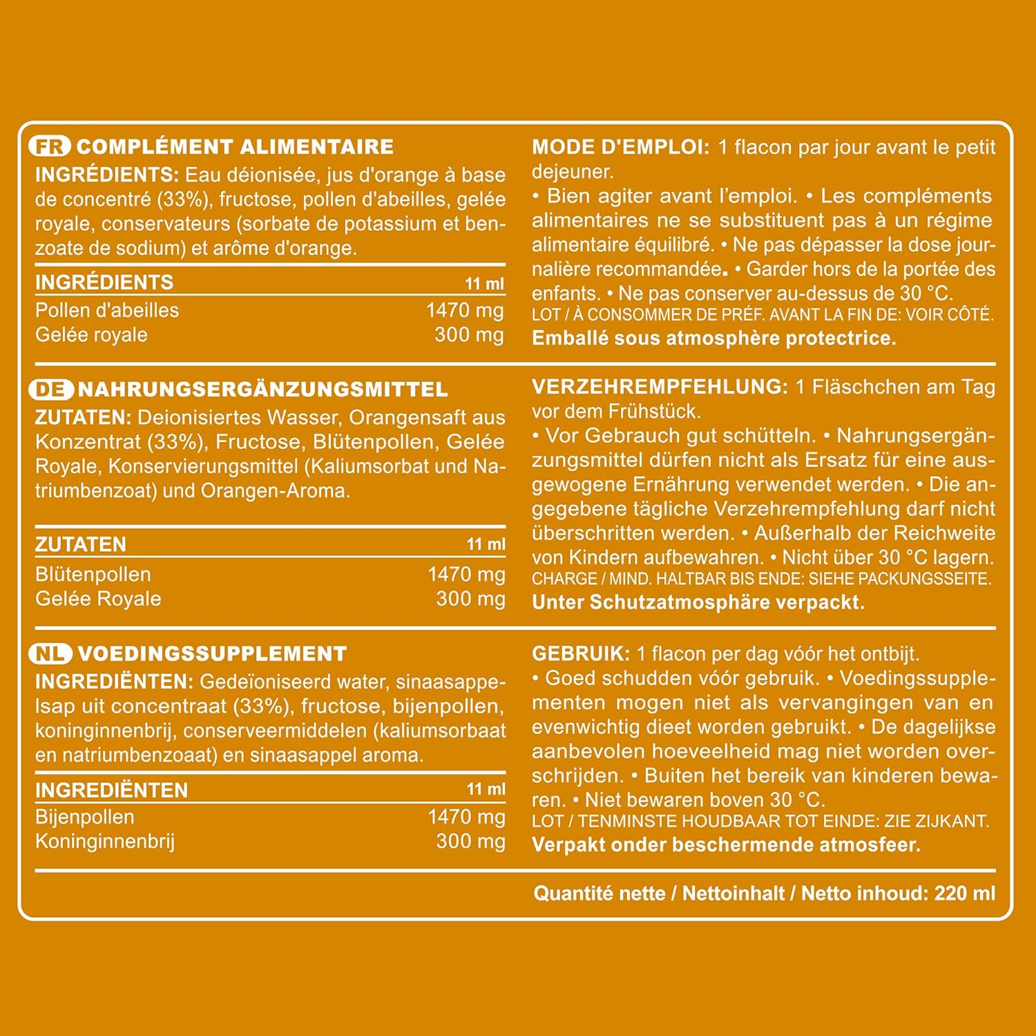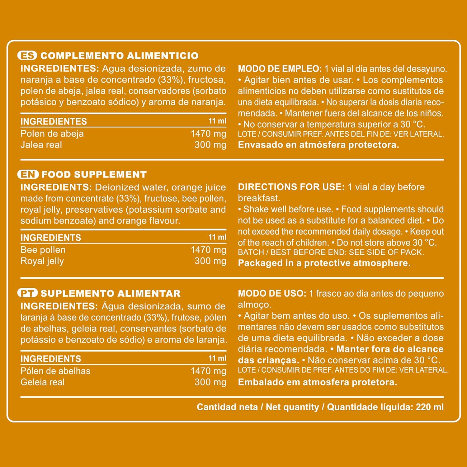 Product Description Marny's Vials Apigel 20Viales Ingredients Deionized water, orange juice based on concentrate (33%), fructose, bee pollen, royal jelly, preservatives (potassium sorbate and sodium benzoate) and orange aroma,Marny's Vials Apigel 20Viales