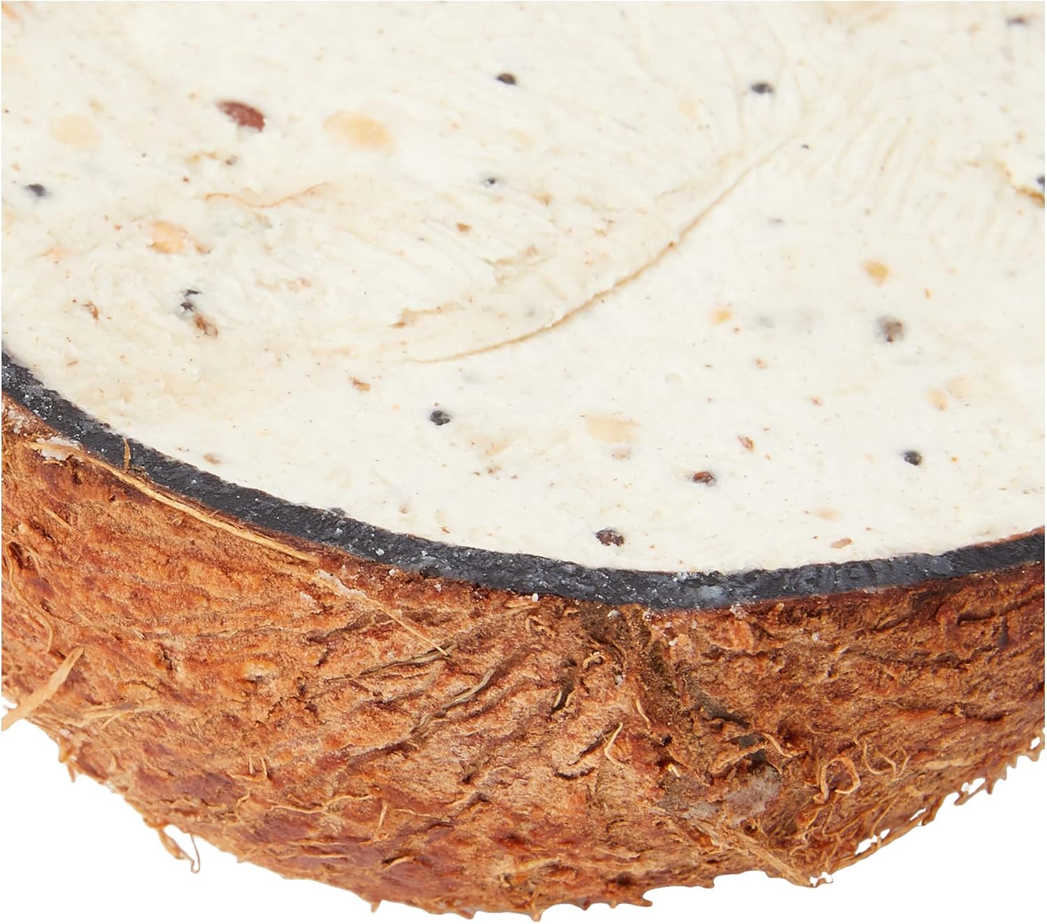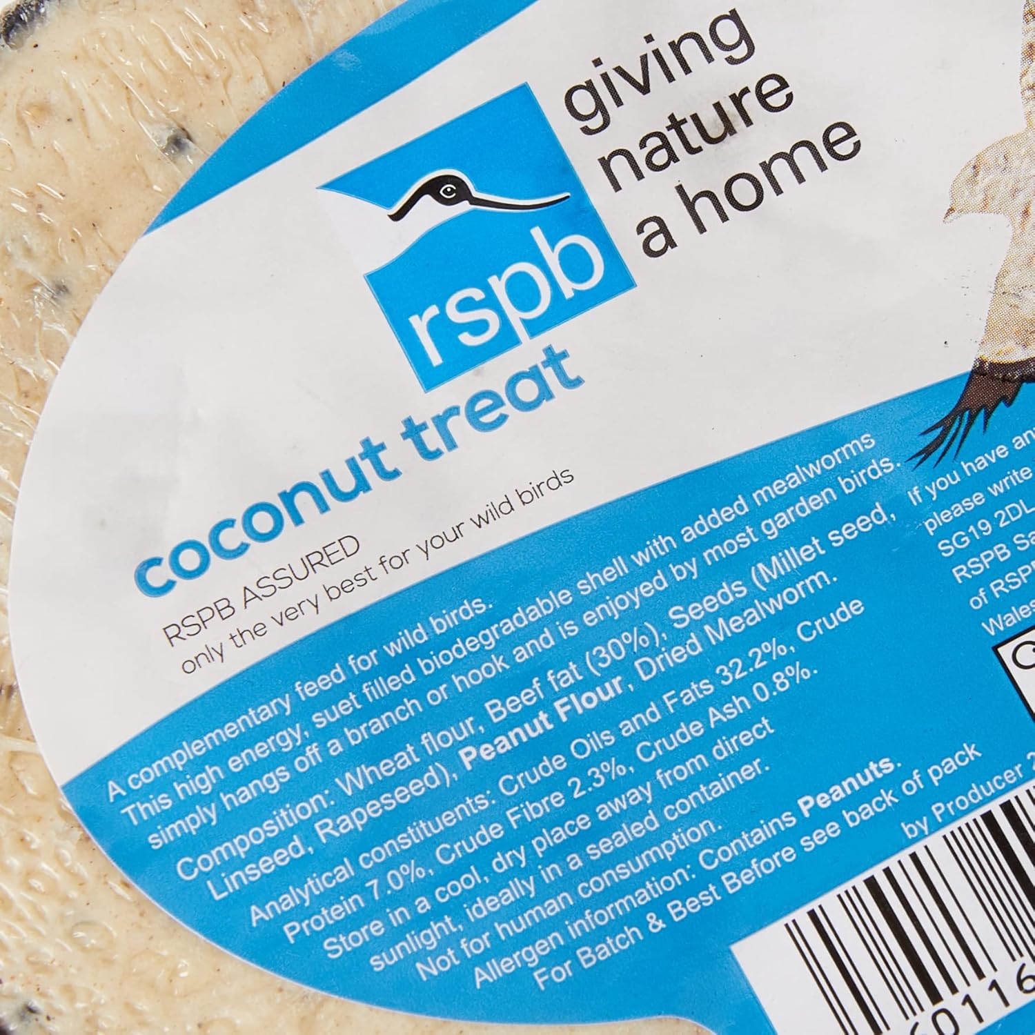 Product Description RSPB Coconut Treats. A best-selling bird food! Who gets more pleasure out of these, the blue tits, long-tailed tits and other beautiful species who devour them - or you watching them clinging to a suspended coconut shell, contentedly pecking at its contents? Each easy-to-hang shell contains a nutritious mix of our premium suet, seeds and cereals, and weighs around 275 g. Supplied in a recyclable cardboard box - perfect for refilling your existing bucket. Filled in the UK. Most garden birds will eat many different foods. Here's a quick guide to the birds that particularly enjoy this food, though other species may also enjoy it too: Coal tit, Blackcap, Blue tit, Great tit, Great spotted woodpecker, long tailed tit, starling Ingredients Premium suet, seeds, cereals P.when('A').execute(function(A) { A.on('a:expander:toggle_description:toggle:collapse', function(data) { window.scroll(0, data.expander.$expander[0].offsetTop-100); }); }); Directions Store in a cool, dry place. Box Contains Bird food Manufacturer Contact Information The Lodge, Sandy, Bedfordshire, SG19 2DL. See more