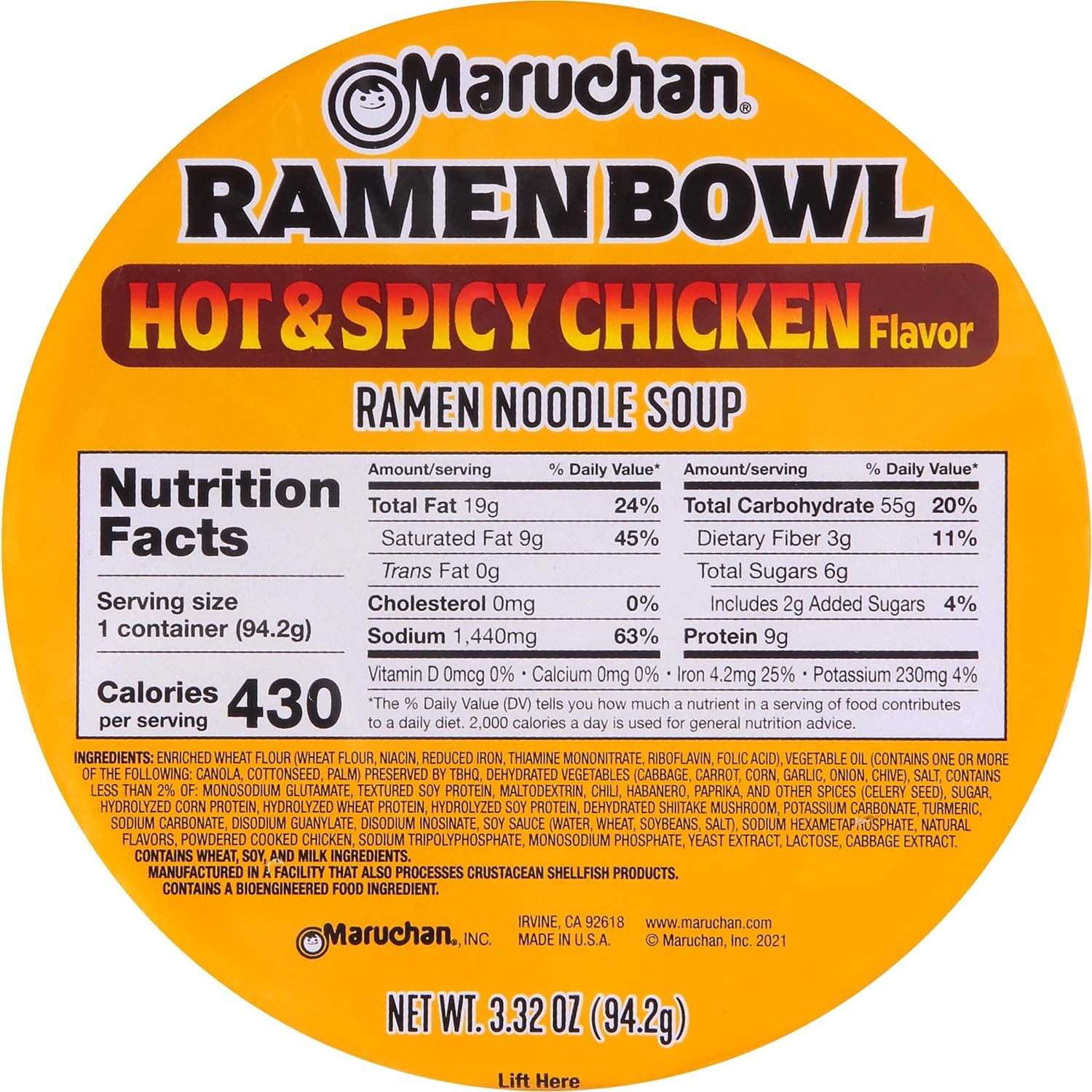 Hot & Spicy Chicken Flavor Ramen Noodles103.32 oz (Pack of 12)10We’ve taken our chicken flavor bowl to the next level10This ramen is on fire10Packaging may vary1012 - 3.32 oz Bowls of Maruchan Hot & Spicy Chicken Flavor Ramen Noodles with Vegetables This ramen is on fire. We’ve taken our chicken flavor bowl to the next level. But can you handle the heat? Packaging may vary