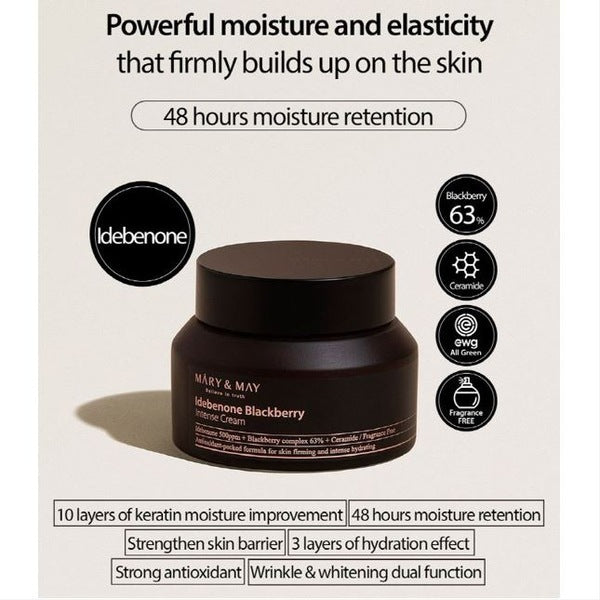 The MARY & MAY Idebenone + Blackberry Complex Intensive Total Care Cream is a powerful moisturizing cream that deeply hydrates and strengthens the skin barrier. It reduces fine lines and wrinkles, fights free radicals, and brightens the skin. Size: 70g