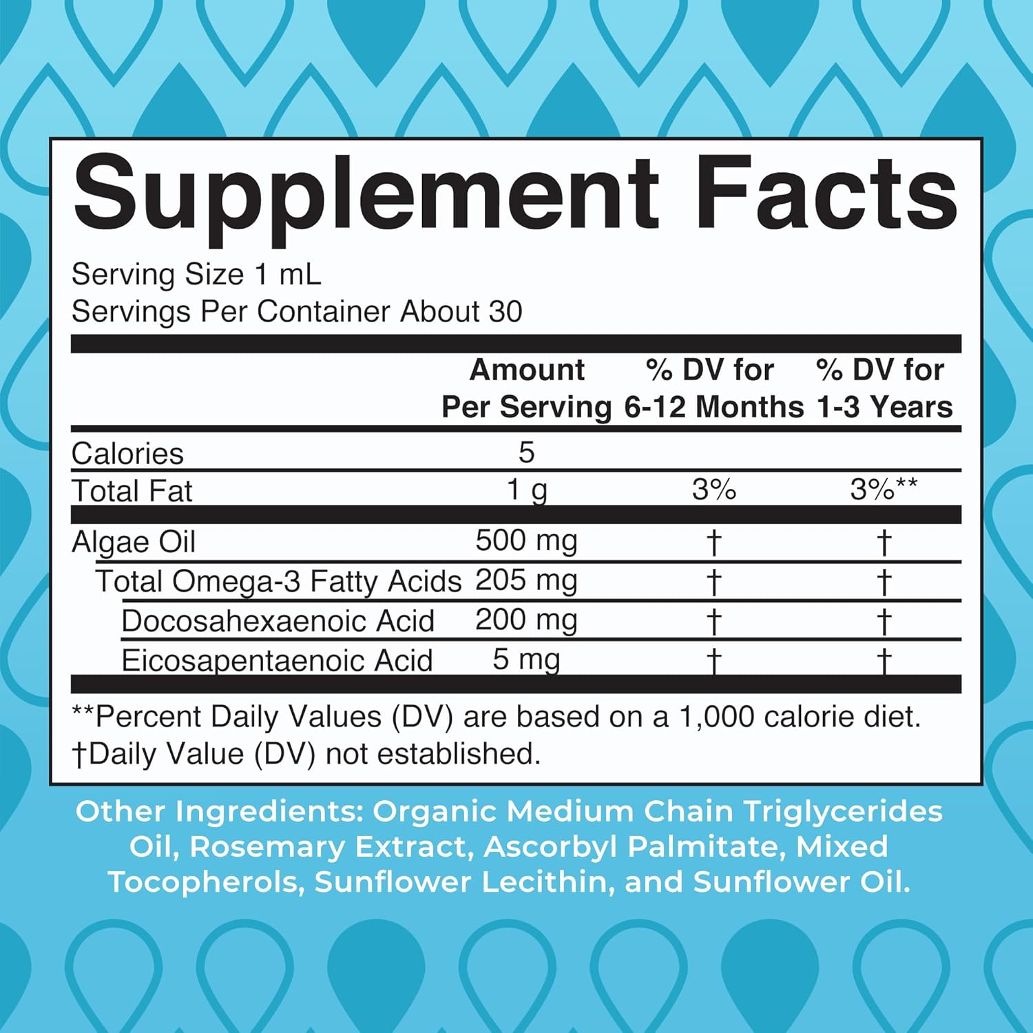 Package Dimensions : ;1.0 Ounce;Item Form;Drop;Item Weight;1 Ounces;Special Ingredients;Omega 3;Diet Type;Vegan;Product Benefits;Overall Wellness, Vision Support, Brain Health Support;Age Range (Description);Baby, Child