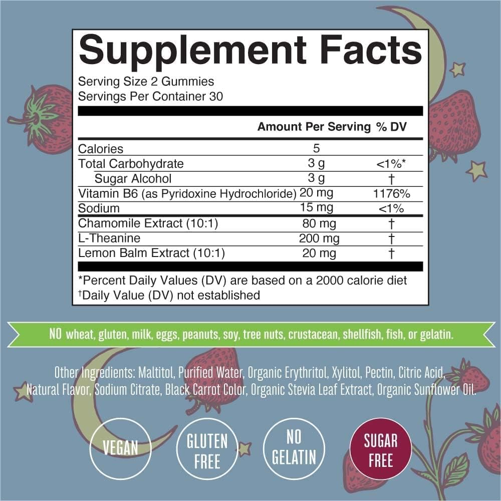 Vegan Formula: Per Serving (2 Gummies): Vitamin B6 (As Pyridoxine Hydrochloride): 20 Mg, Sodium: 15 Mg, Chamomile Extract (10:1): 80 Mg, L-Theanine: 200 Mg, Lemon Balm Extract (10:1): 20 Mg. Other Ingredients: Maltitol, Purified Water, Organic Erythritol, Xylitol, Pectin, Citric Acid, Natural Flavor, Sodium Citrate, Black Carrot Color, Organic Stevia Leaf Extract, Organic Sunflower Oil
