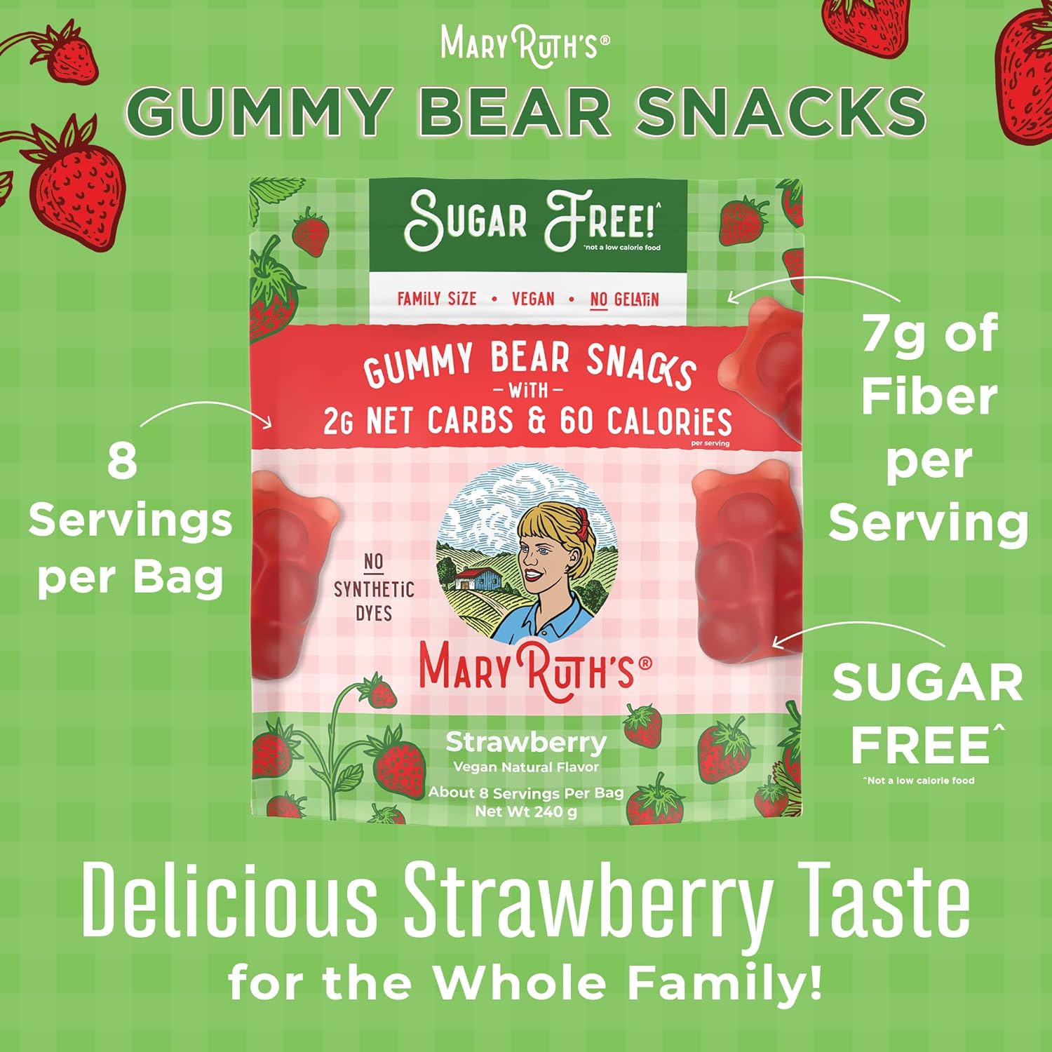 Delicious Gummy Bear Snacks: Our soft | mouth-watering gummy bears are available in 4 fruity flavors | with sugar free options for all (8 assortments total). Delectable gummies for adult and kids!Resealable Pouch: With our resealable zippers | you can take this wholesome treat anywhere! Perfect snack for work | school | or whenever you're on the go. Each family size pack of MaryRuth's gummies contain about 8 servings per container!Wholesome Treat: MaryRuth's gummy snacks in a delicious strawberry flavor contain only 60 calories | with 7g of fiber and 0g of added sugars per serving!Vegan Formula: Maltitol | Soluble Tapioca Syrup | Purified Water | Organic Erythritol | Xylitol | Pectin | Citric Acid | Natural Strawberry Flavor | Sodium Citrate | Magnesium Citrate | Tricalcium Phosphate | Black Carrot Juice Color | Organic Stevia Leaf Extract | Evaporated Coconut Water | and Organic Sunflower OilFor Most Lifestyles: MaryRuth's Gummy Snacks are Sugar Free | Vegan | No Gelatin | No Synthetic Dyes | Non-GMO | Gluten Free | Made in a GMP Facility. This product CONTAINS COCONUT