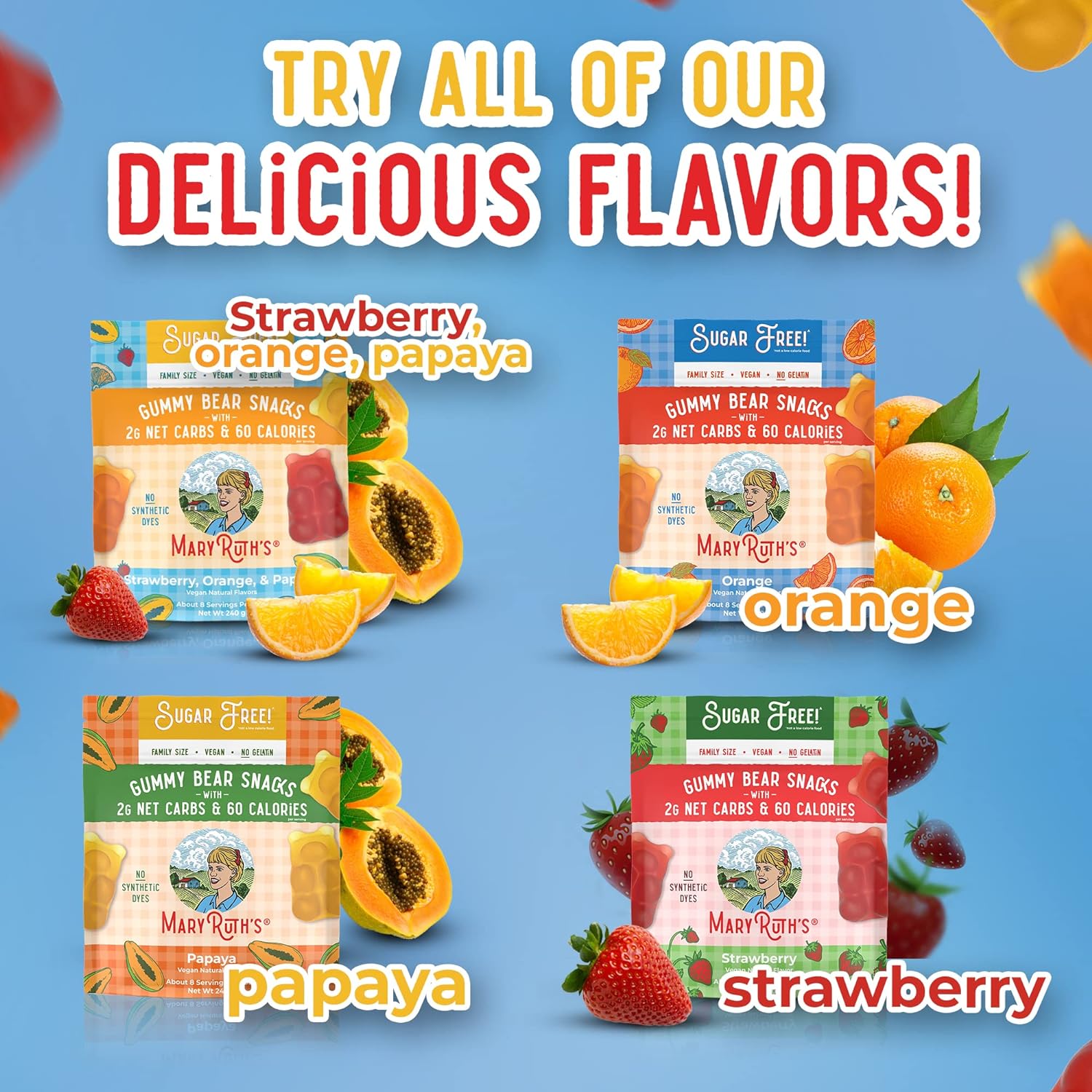 Delicious Gummy Bear Snacks: Our soft | mouth-watering gummy bears are available in 4 fruity flavors | with sugar free options for all (8 assortments total). Delectable gummies for adult and kids!Resealable Pouch: With our resealable zippers | you can take this wholesome treat anywhere! Perfect snack for work | school | or whenever you're on the go. Each family size pack of MaryRuth's gummies contain about 8 servings per container!Wholesome Treat: MaryRuth's gummy snacks in a delicious Orange flavor contain only 60 calories | with 7g of fiber and 0g of added sugars per serving!Vegan Formula: Maltitol | Soluble Tapioca Syrup | Purified Water | Organic Erythritol | Xylitol | Pectin | Citric Acid | Natural Orange Flavor | Sodium Citrate | Magnesium Citrate | Tricalcium Phosphate | Organic Stevia Leaf Extract | Evaporated Coconut Water | and Organic Sunflower OilFor Most Lifestyles: MaryRuth's Gummy Snacks are Sugar Free | Vegan | No Gelatin | No Synthetic Dyes | Non-GMO | Gluten Free | Made in a GMP Facility. This product CONTAINS COCONUT