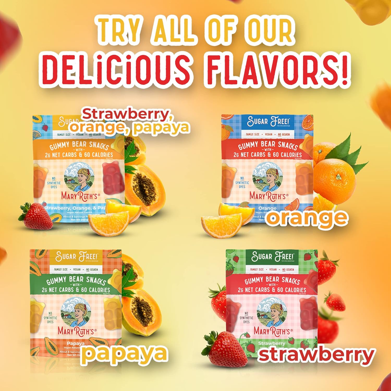 Delicious Gummy Bear Snacks: Our soft | mouth-watering gummy bears are available in 4 fruity flavors | with sugar free options for all (8 assortments total). Delectable gummies for adult and kids!Resealable Pouch: With our resealable zippers | you can take this wholesome treat anywhere! Perfect snack for work | school | or whenever you're on the go. Each family size pack of MaryRuth's gummies contain about 8 servings per container!Wholesome Treat: MaryRuth's gummy snacks in a delicious Strawberry | Orange | and Papaya flavors contain only 60 calories | with 7g of fiber and 0g of added sugars per serving!Vegan Formula: Maltitol | Soluble Tapioca Syrup | Purified Water | Organic Erythritol | Xylitol | Pectin | Citric Acid | Natural Flavors | Sodium Citrate | Magnesium Citrate | Tricalcium Phosphate | Black Carrot Juice Color | Organic Stevia Leaf Extract | Evaporated Coconut Water | and Organic Sunflower OilFor Most Lifestyles: MaryRuth's Gummy Snacks are Sugar Free | Vegan | No Gelatin | No Synthetic Dyes | Non-GMO | Gluten Free | Made in a GMP Facility. This product CONTAINS COCONUT