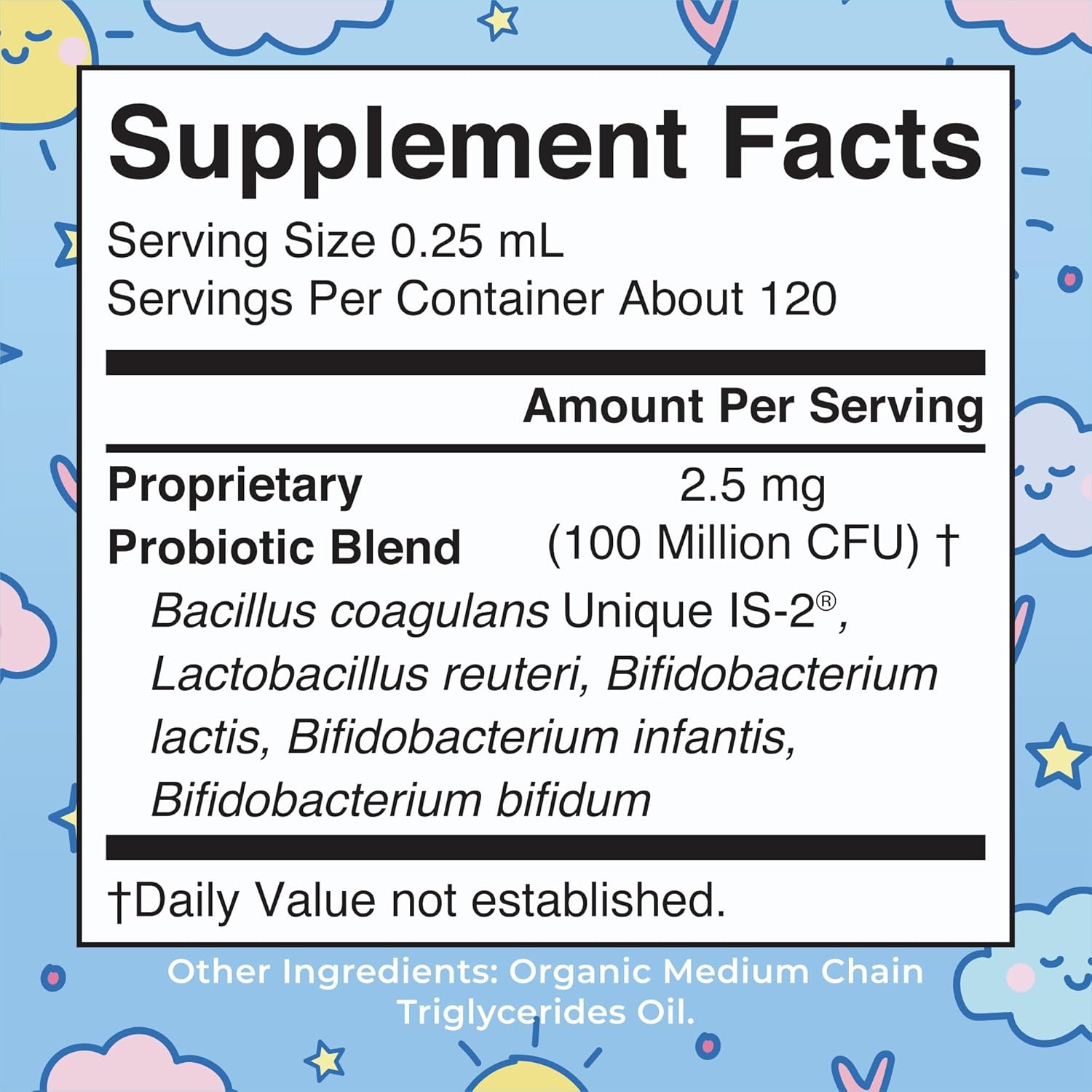 Infant Probiotic: This USDA Certified Organic Infant Liquid Probiotic is formulated for the unique microbiome of an infantās developing digestive system. Our proprietary blend includes Bacillus coagulans Unique IS-2, Lactobacillus reuteri, Bifidobacterium lactis, Bifidobacterium infantis, and Bifidobacterium bifidum