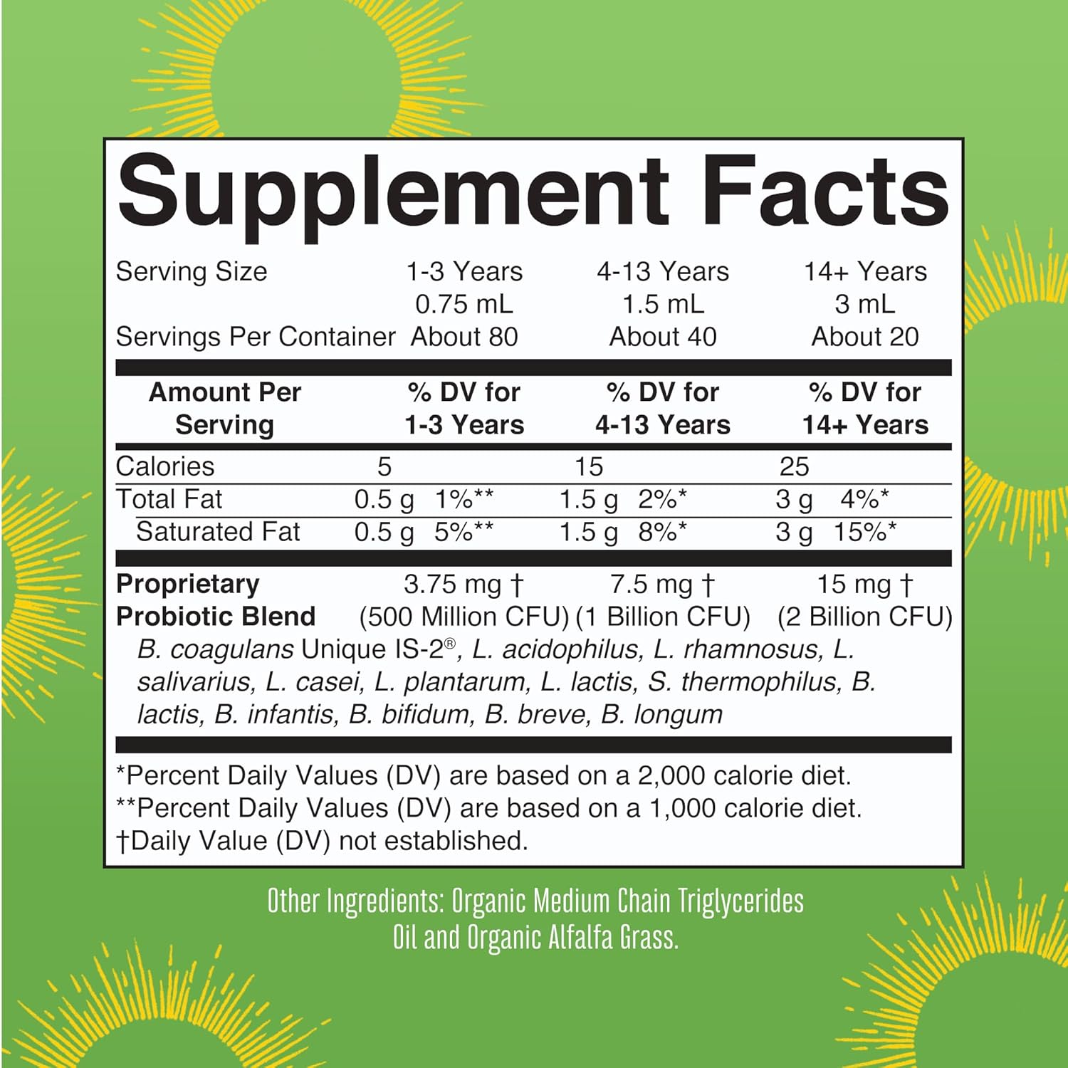 Package Dimensions : ;2 Fluid Ounces;Item Form;Liquid;Item Weight;4 ounces;Special Ingredients;13 Strains, Organic Alfalfa Grass, Acidophilus, Organic Medium Chain Triglyceride (MCT) oil;Diet Type;Vegan;Product Benefits;Digestive Health Support;Age Range (Description);Adult,Kid