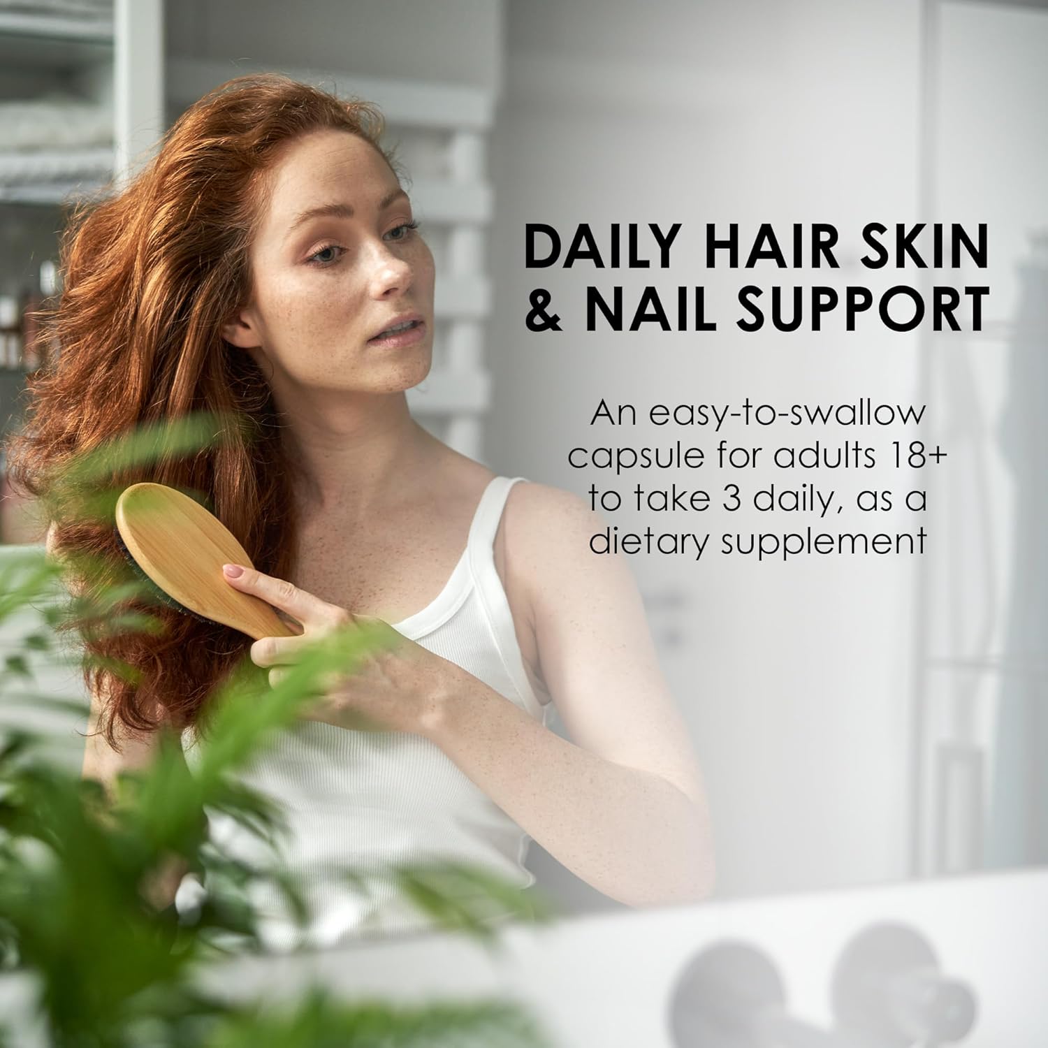 DAILY HAIR SKIN & NAIL SUPPORT: An easy-to-swallow capsule that adults 18+ take 3 daily, as a dietary supplement