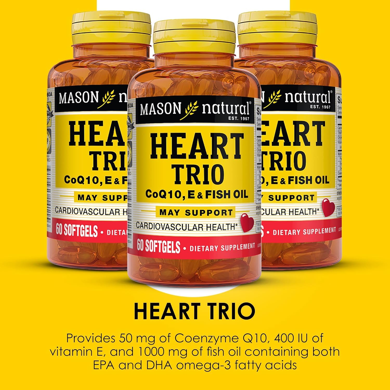 About this item DAILY HEART HEALTH: For adults 18+ to take 2 softgels daily, peferably with food, as a dietary supplement HEART TRIO: Provides 50 mg of Coenzyme Q10, 400 IU of vitamin E, and 1000 mg of fish oil containing both EPA and DHA omega-3 fatty acids BENEFITS: High potency blend of these three important heart supplements which may help support a healthy heart CLEAN INGREDIENTS: Guaranteed to have no added sugar, starch, corn, wheat, dairy, or egg. Contains no artificial fragrance, flavors, or preservatives TRUSTED FOR OVER 50 YEARS: Mason Natural has produced quality vitamin supplements for over five decades, adhering to cGMPs (current Good Manufacturing Practices) and US guidelines with rigorous testing & inspections See more product details,DAILY HEART HEALTH: For adults 18+ to take 2 softgels daily, peferably with food, as a dietary supplement,HEART TRIO: Provides 50 mg of Coenzyme Q10, 400 IU of vitamin E, and 1000 mg of fish oil containing both EPA and DHA omega-3 fatty acids,BENEFITS: High potency blend of these three important heart supplements which may help support a healthy heart,CLEAN INGREDIENTS: Guaranteed to have no added sugar, starch, corn, wheat, dairy, or egg. Contains no artificial fragrance, flavors, or preservatives,TRUSTED FOR OVER 50 YEARS: Mason Natural has produced quality vitamin supplements for over five decades, adhering to cGMPs (current Good Manufacturing Practices) and US guidelines with rigorous testing & inspections